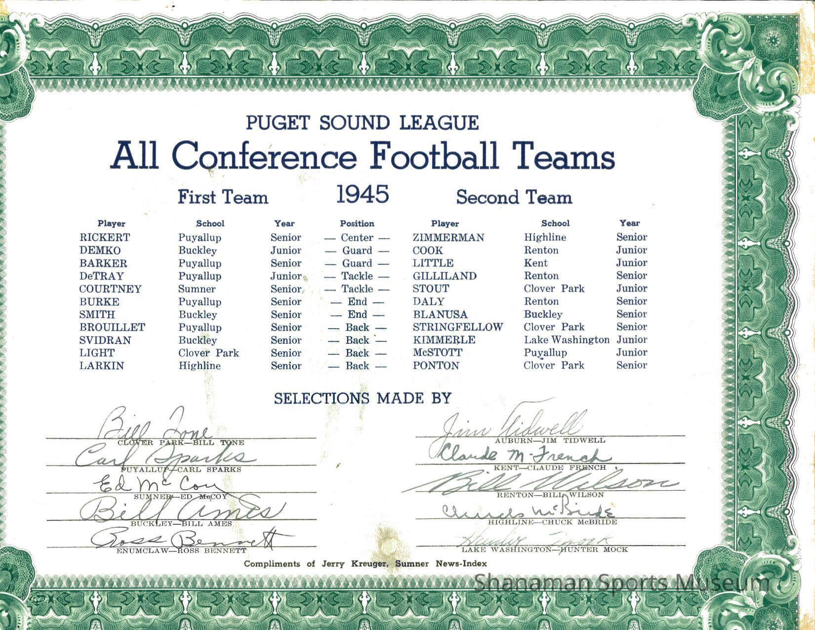 certificate, Puget Sound League All Conference Football Teams, 1945.Lexicon