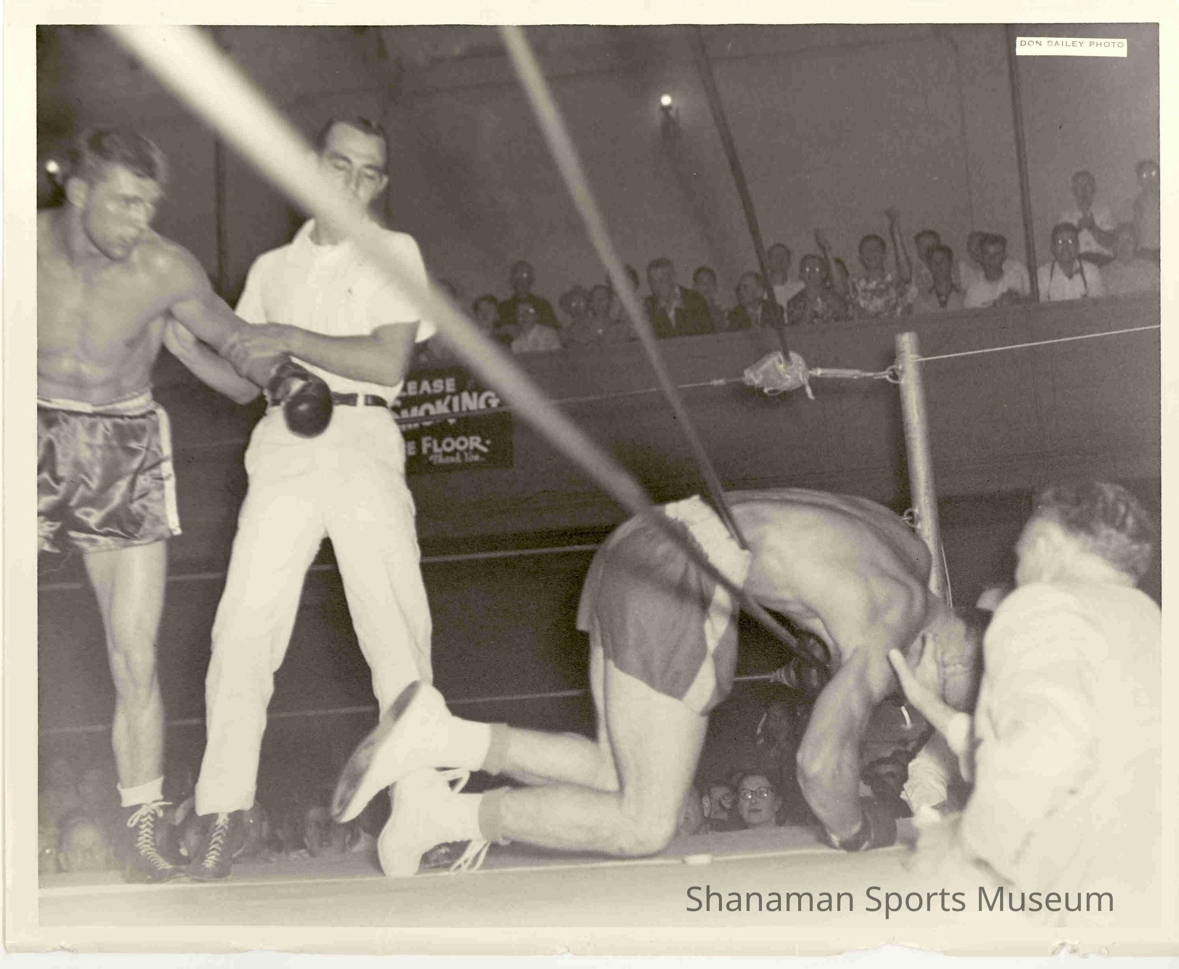 Pat McMurtry is ready to go on the attack after knocking Bill Boatman to the canvas in a professional heavyweight fight back in 1954 at the Tacoma Armory. Referee Davey Ward waits for Boatman to get up to his feet. McMurtry, who was in his first year as a pro fighter, won the fight and continued his climb to contention. In a few years, McMurtry's father, Clarence McMurtry, who was his son's manager, turned down an offer to fight heavyweight champ Floyd Patterson. It was a decision Pat would regret.Made/Created