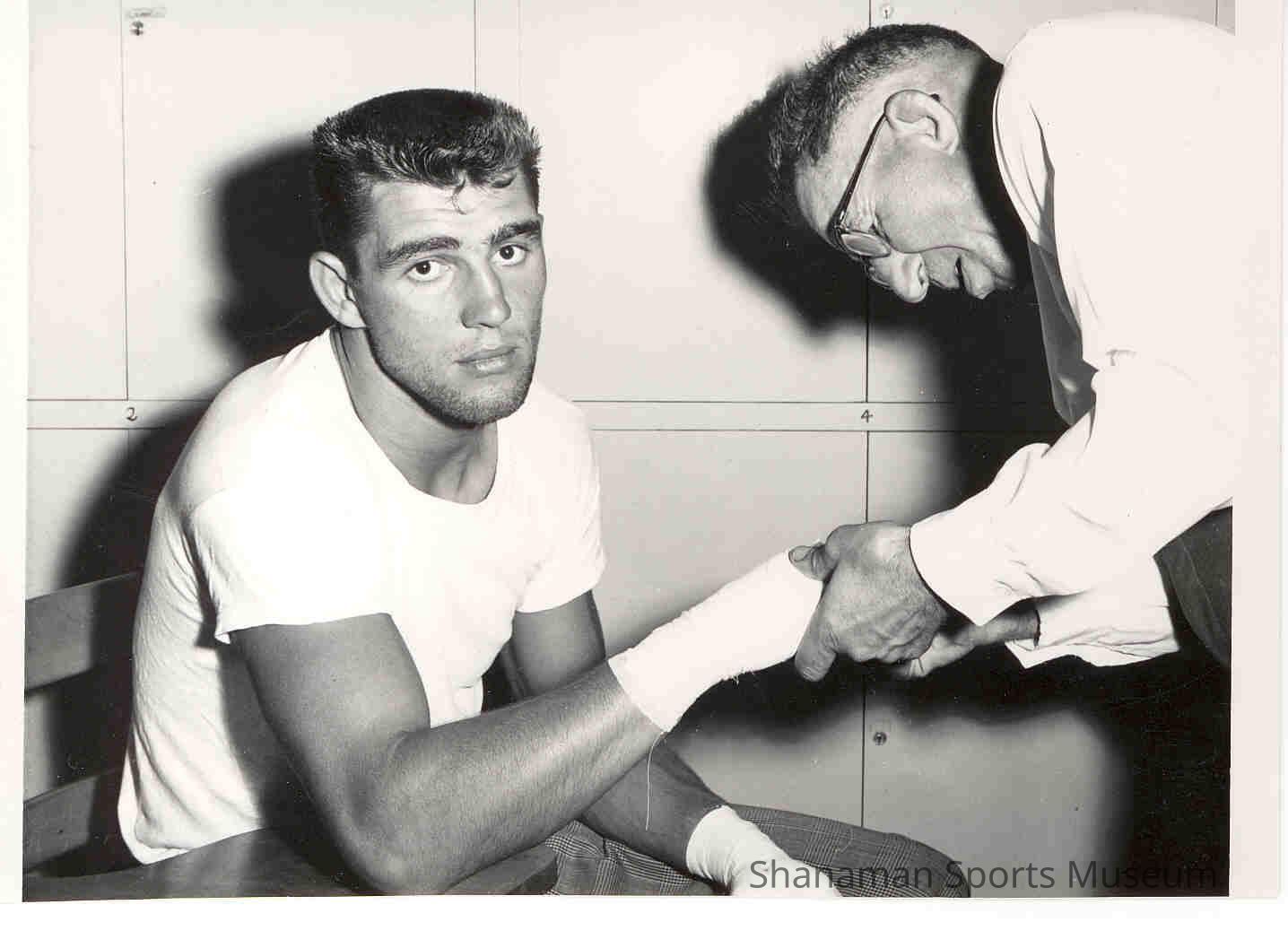 Prior to a fight in 1955, Tacoma's heavyweight contender Pat McMurtry gets his hands tapped by Frankie “Chi Chi” Britt. After going 103-2 in a successful amateur career, McMurtry turned pro in 1954 after serving in the Marines during the Korean War and went on to become a heavyweight contender. Britt fought professionally during the 1920s and brought insight and advice to the corner for McMurtry. In 1956, the pride of Tacoma put a five bout win streak on the line when he faced German veteran Wili Besmanoff. McMurtry entered the fight ranked fifth in the world. Unfortunately for McMurtry, he fought tentatively lost a split decision. The next day McMurtry went to the hospital and was diagnosed with pneumonia.Lexicon