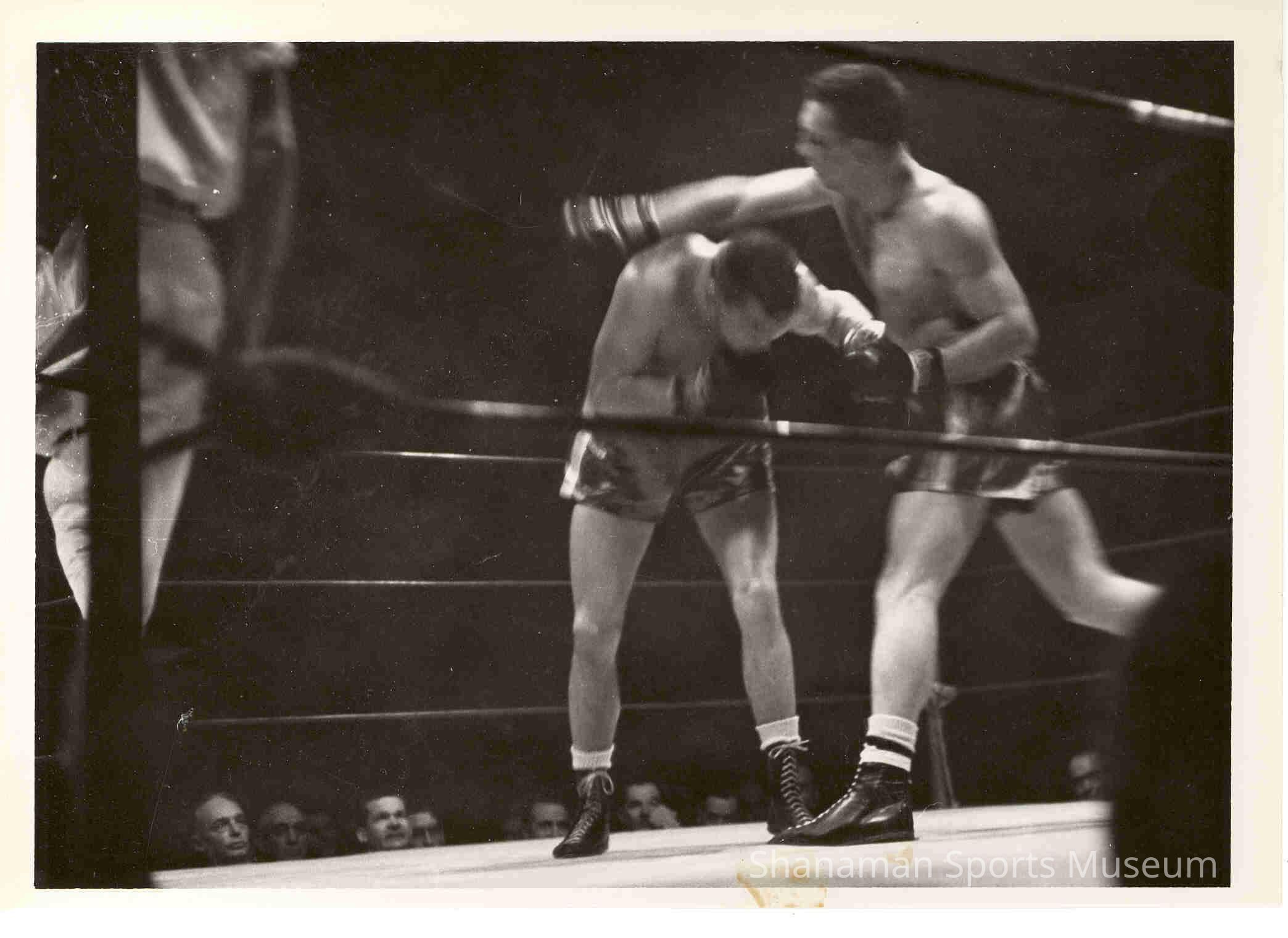 Pat McMurtry ducks under a hard right-hand punch from Chuck Woodworth and counters with a jab to Woodward's midsection in a fight that occurred in 1956. It was McMurtry's third year as a professional fighter. When McMurtry turned pro in 1954, his father, Clarence, became his manager. Clarence was a big influence in Pat and his younger brother, Mike, becoming boxers. When his sons were about 6 years old, he gave them boxing gloves for a Christmas gift and later when they were still young they would box each other prior to a main boxing event in Tacoma.Lexicon