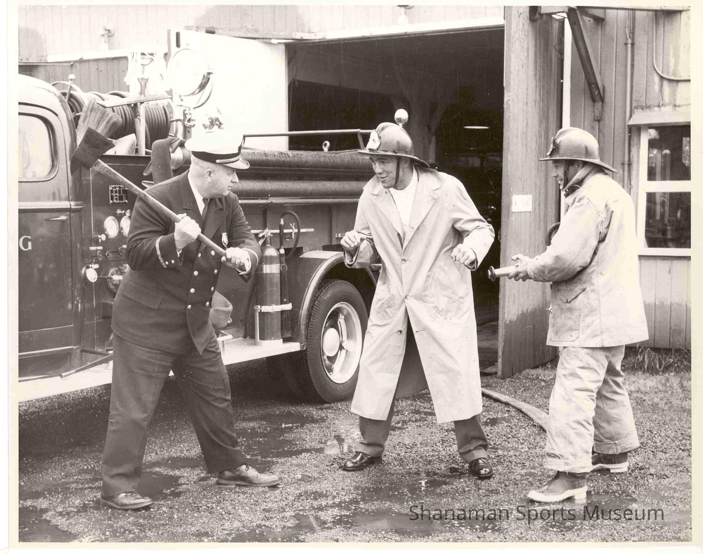 In a humorous moment, Pat McMurtry (middle) dresses up in fireman's gear along with his sparring partner, Jim Walls, and posses for a comical photo with a member of the Portland Fire Department back in 1955. McMurtry, who turned pro as a boxer in 1954, was in Portland for another fight. When McMurtry turned pro after a successful amateur career (he lost only twice in 105 amateur fights), he chose his father, Clarence, to be his manager. His father had a huge influence in why McMurtry got into boxing. When Clarence was married, he told his wife they were going to have two sons and both were going to be boxers. Both Pat and his younger brother, Mike, are considered to be two of the best boxers to come out of Tacoma. They've both been inducted into the Tacoma-Pierce County Sports Hall of Fame.Lexicon