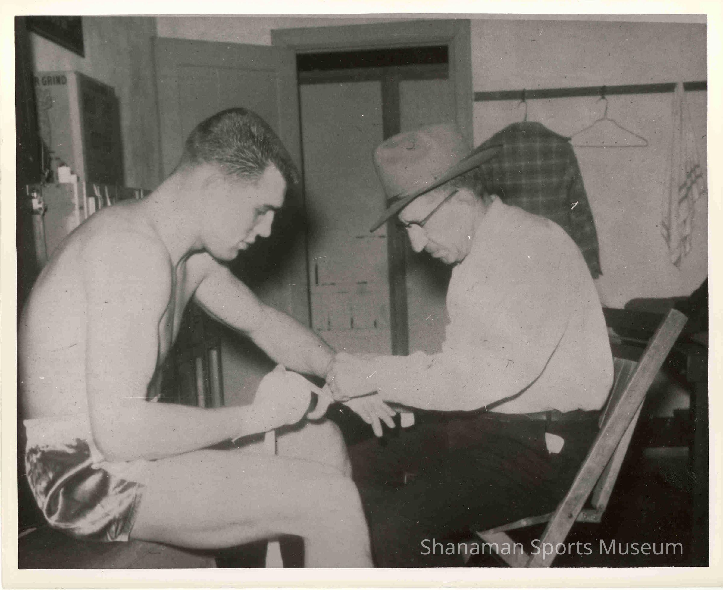 Prior to a fight in the 1950s, Pat McMurtry has his hands taped by Frankie “Chi Chi” Britt. Britt was a longtime fighter in Tacoma and fought back in the 1920s. Because of his success as a boxer and his contributions as a coach and a trainer, Britt was inducted into the Tacoma-Pierce County Sports Hall of Fame back in 1972. He worked with McMurtry over the years and helped him develop into a heavyweight contender during the 1950s. McMurtry fought professionally from 1954 to late 1959. Like Britt, McMurtry has been inducted into the Tacoma-Pierce Country Sports Hall of Fame.Lexicon