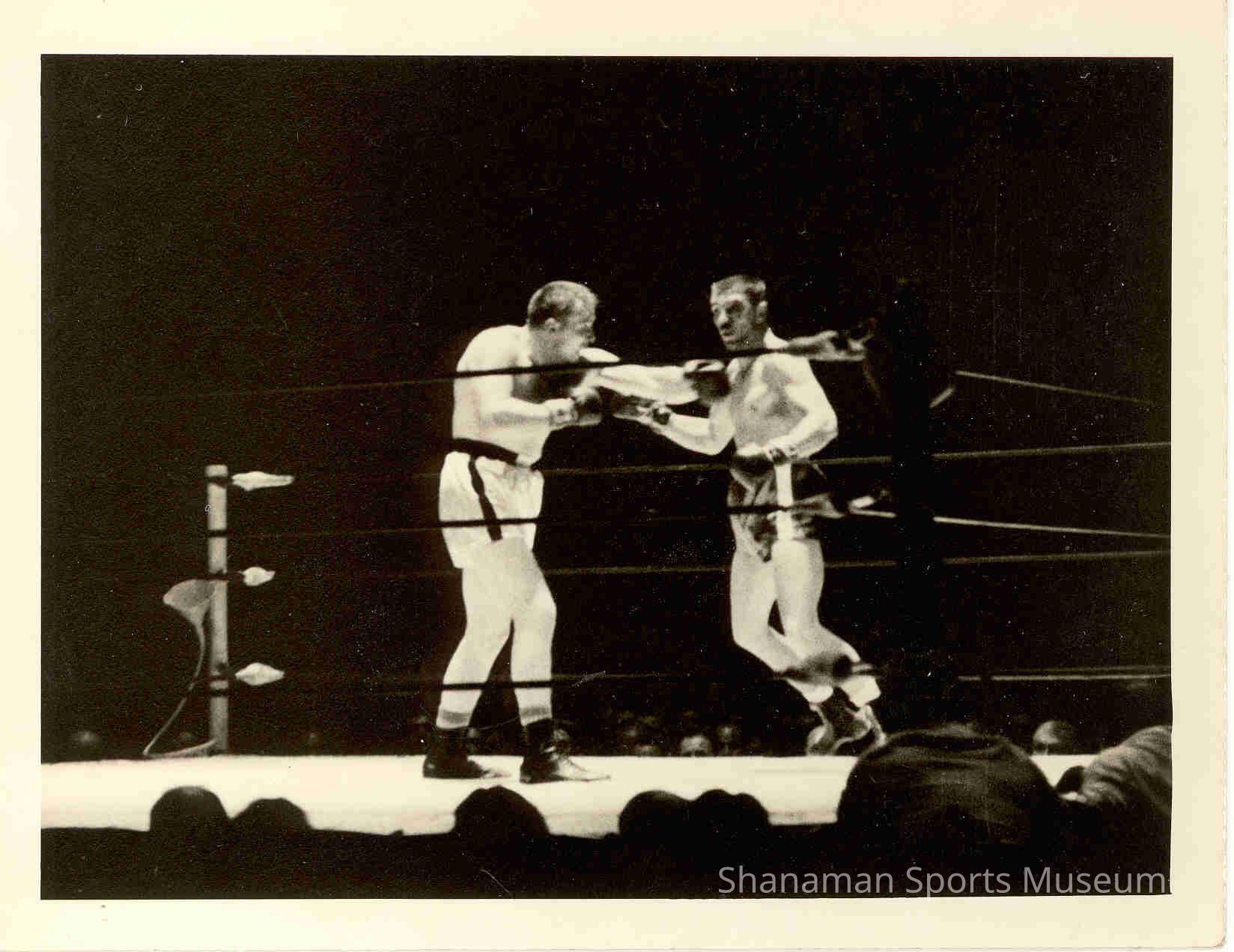 A bloodied Pat McMurtry takes a right jab to the chest from Bob Albright in this heavyweight bout in 1955 that took place in Seattle. With Albright's 28-pound weight advantage, he landed a lot of inside punches. But McMurtry used his quickness to stay on the attack. However, the fight was stopped in the eighth round because McMurtry had injured his hand in the third round and the fight was ruled a draw. But McMurtry got the win in a rematch fight with Albright on Oct. 13, 1959 when he won by a fifth-round technical knockout. Weeks later, McMurtry would fight his last fight and lost to Eddie Machen, who won by a first-round knockout.Lexicon