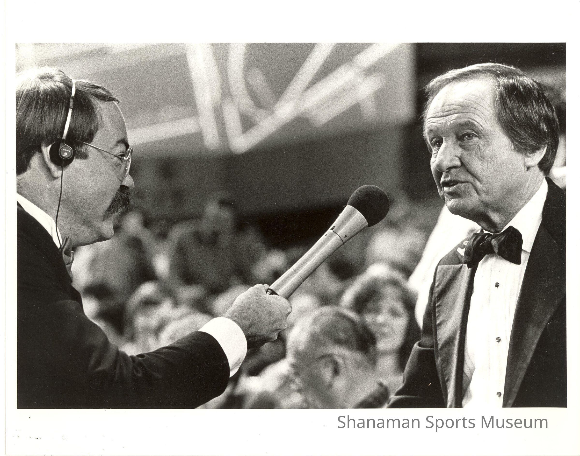 Tacoma broadcaster Art Popham (left), former radio voice of Tacoma minor league baseball, talks to ABC legend Jim McKay at the Tacoma Dome. Popham grew up in Kansas City where he was a bat boy for the Kansas City Athletics. By the age of 20 he was the A's public relations director. He moved to Oakland with the team before finding his destiny in Tacoma. He covered Tacoma Tigers, Yankees, Twins and Tugs games for KMO radio. With Doug McArthur, Popham hosted a radio show on Tacoma sports called "Live from the Leaf" on Friday nights, 1977-81. Popham went on to write a business column for The News Tribune.
