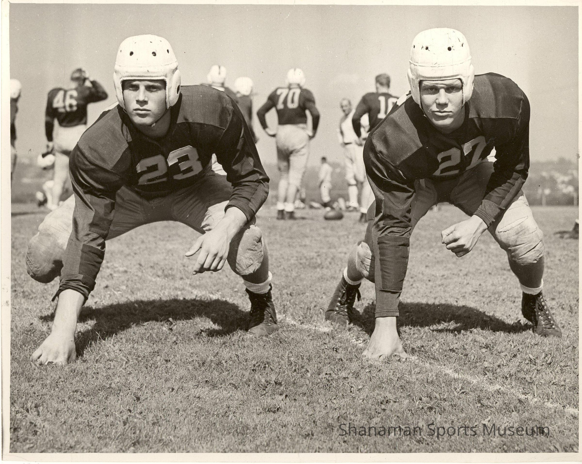 Bill McGovern, wearing jersey number 23, gets into a three-point stance along with a teammate from Stadium High School's 1943 football team. Because of World War II and because many high school students were graduating early and enlisting, McGovern got a distinct honor. He became the only one to play high school and college football in the same season. McGovern enrolled at the University of Washington just two weeks after he played his final high school game. He played in the Rose Bowl at age 17 with the Huskies on Jan. 1, 1944. McGovern died Jan. 16, 1972 at age 45.Lexicon
