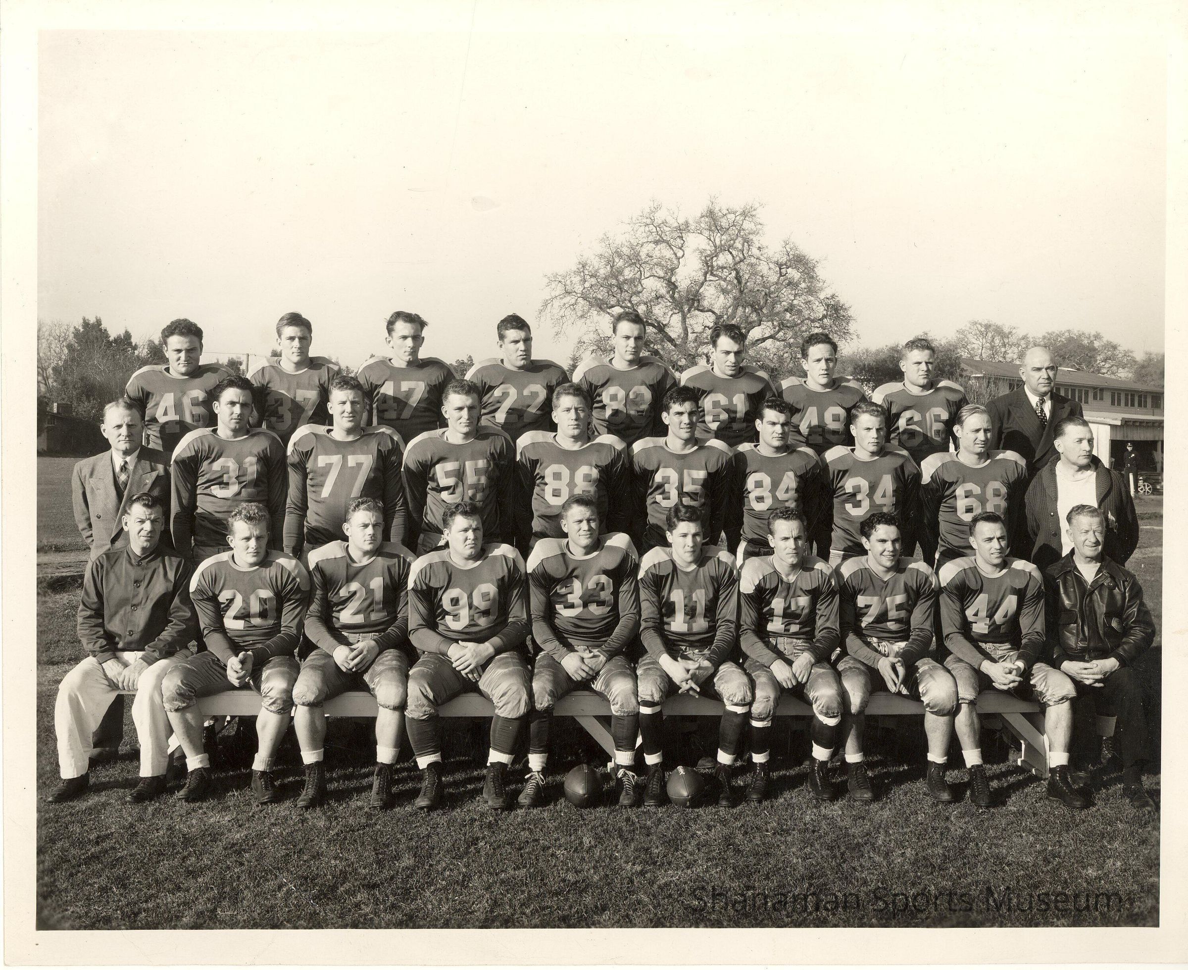 Twenty four Stadium High School football players pose along with five others in street clothes for a team photograph in 1943.Lexicon