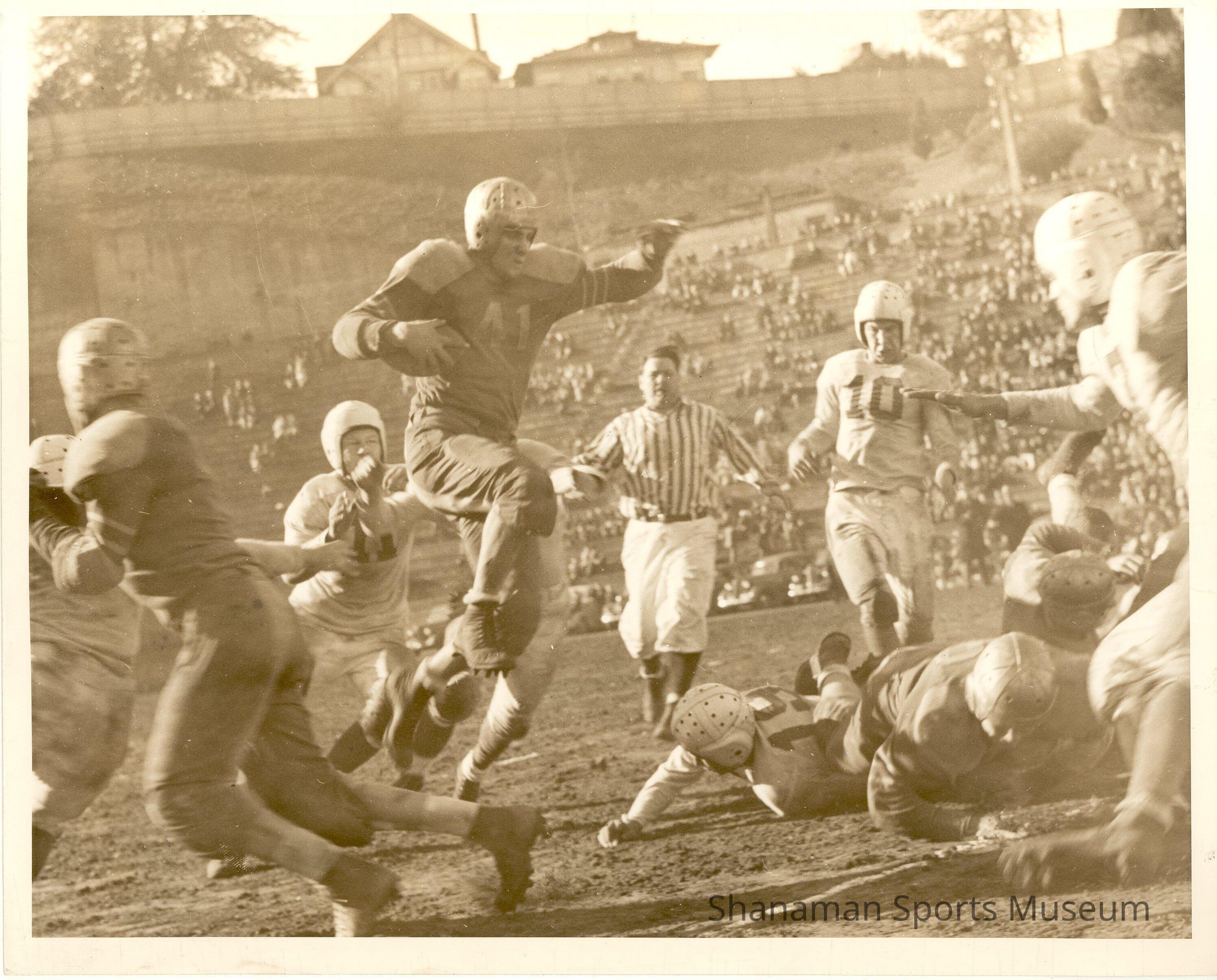 No. 41 for the Stadium Tigers carries the football during a high school football game in 1943, believed to have been played at Stadium Bowl.Lexicon