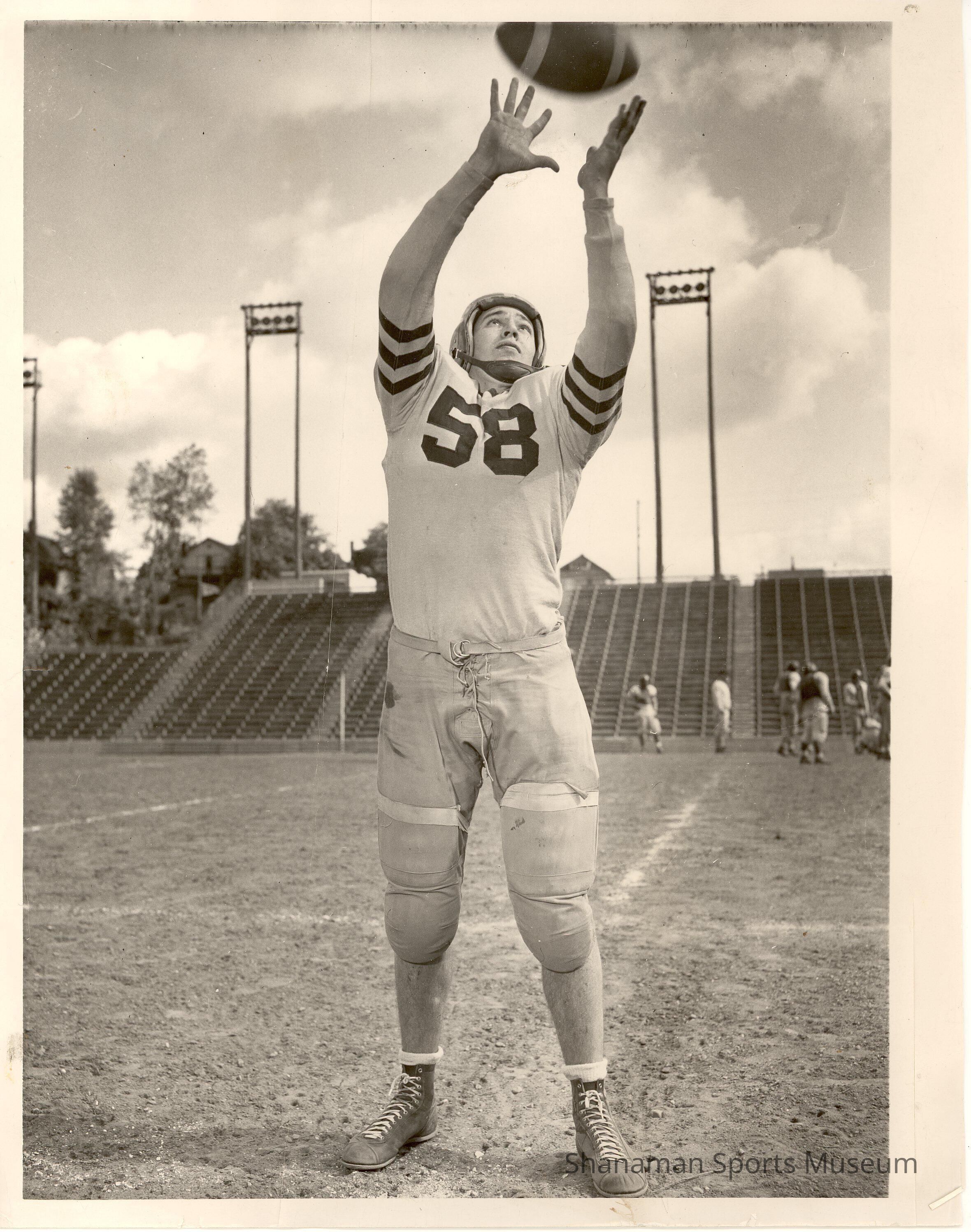 Duane Lowell makes a catch for Lincoln High School during a practice in Lincoln Bowlin in 1954. A three-sport letterman, Lowell was a co-captained in the 1955 all-state football game. He was then a two-way starter for the University of Washington Huskies and was a co-captian his senior season in 1958. Lowell taught and coached at Shoreline Community College and then at Bothell High School and later was a superintendent at the Anacortes School District from 1977 to 1991 before retiring.Lexicon