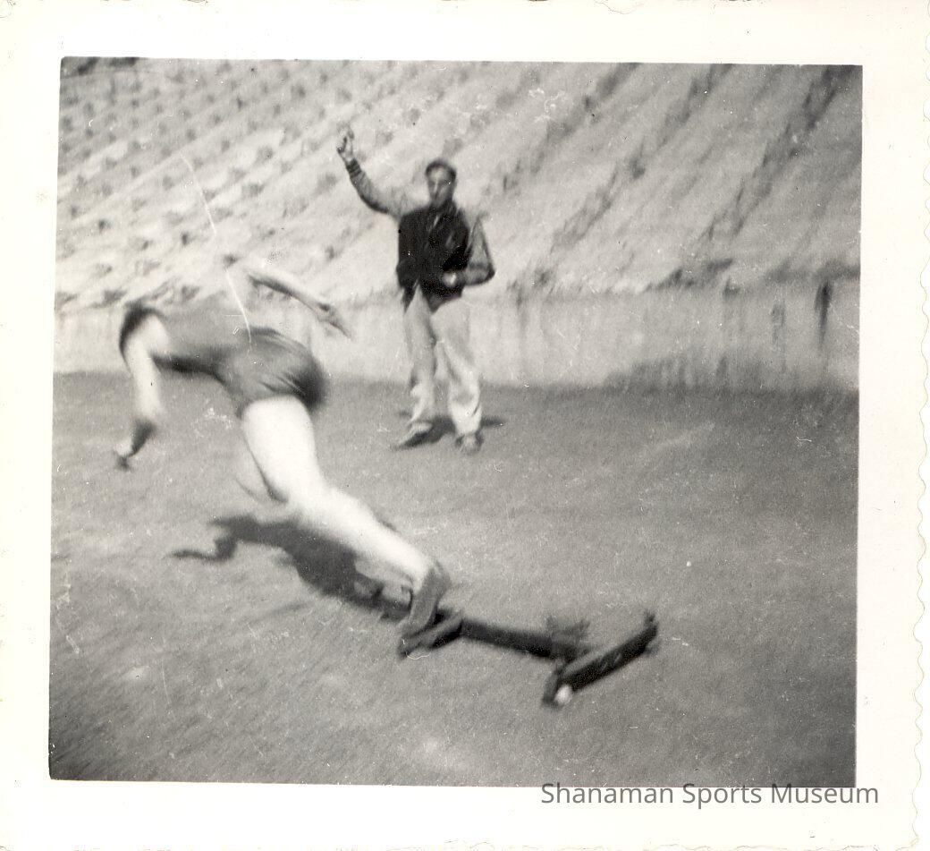 Former Lincoln High track star Dale Larson practices starting from the blocks in the Lincoln Bowl in 1947 while his coach, John Sharp, fires the starting pistol. Larson went to College of Puget Sound (now University of Puget Sound) where he was a member of the Loggers’ undefeated 1948 team.