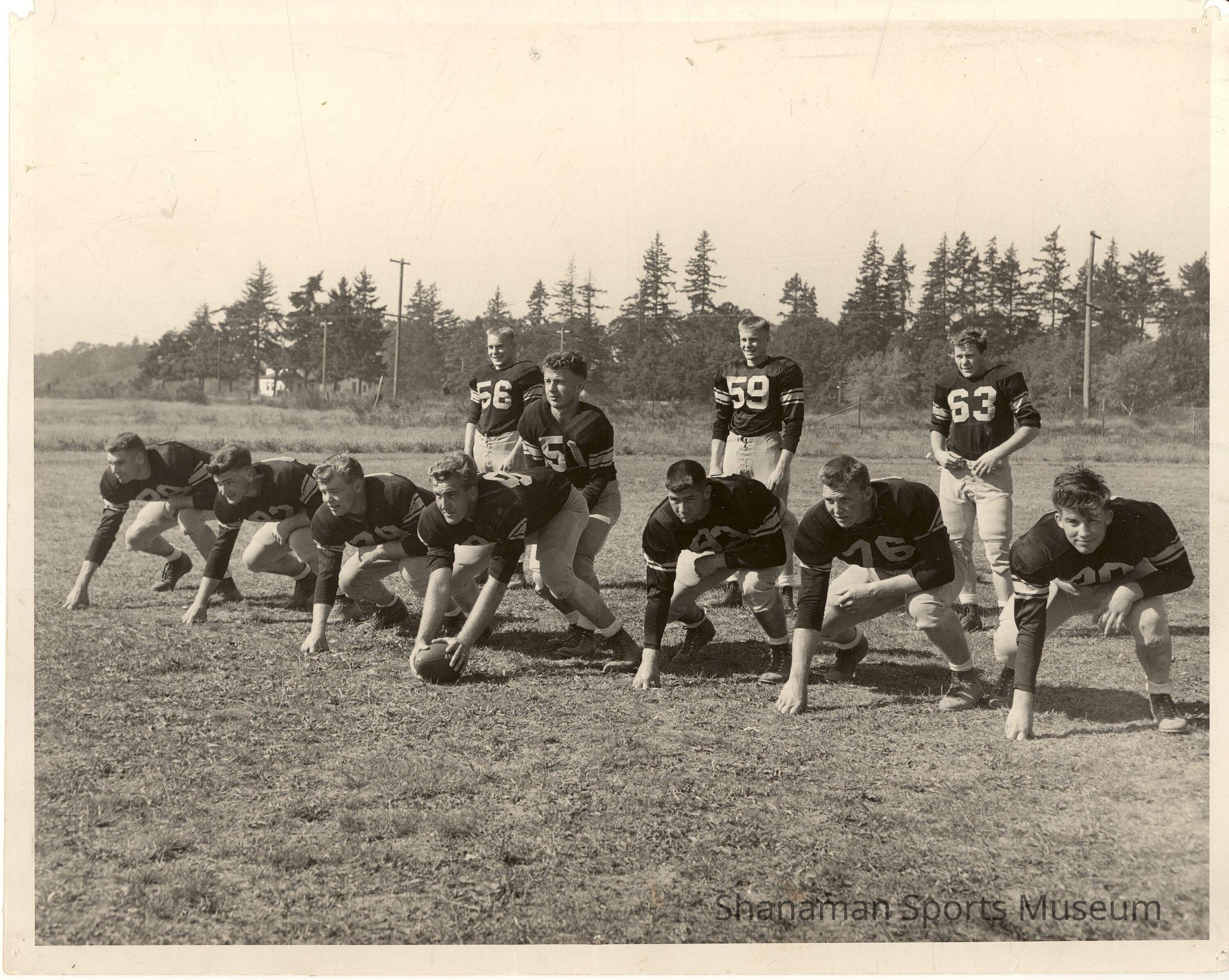 Members of the offense of the 1946 Lincoln High School football team line up in formation for a photo.Lexicon
