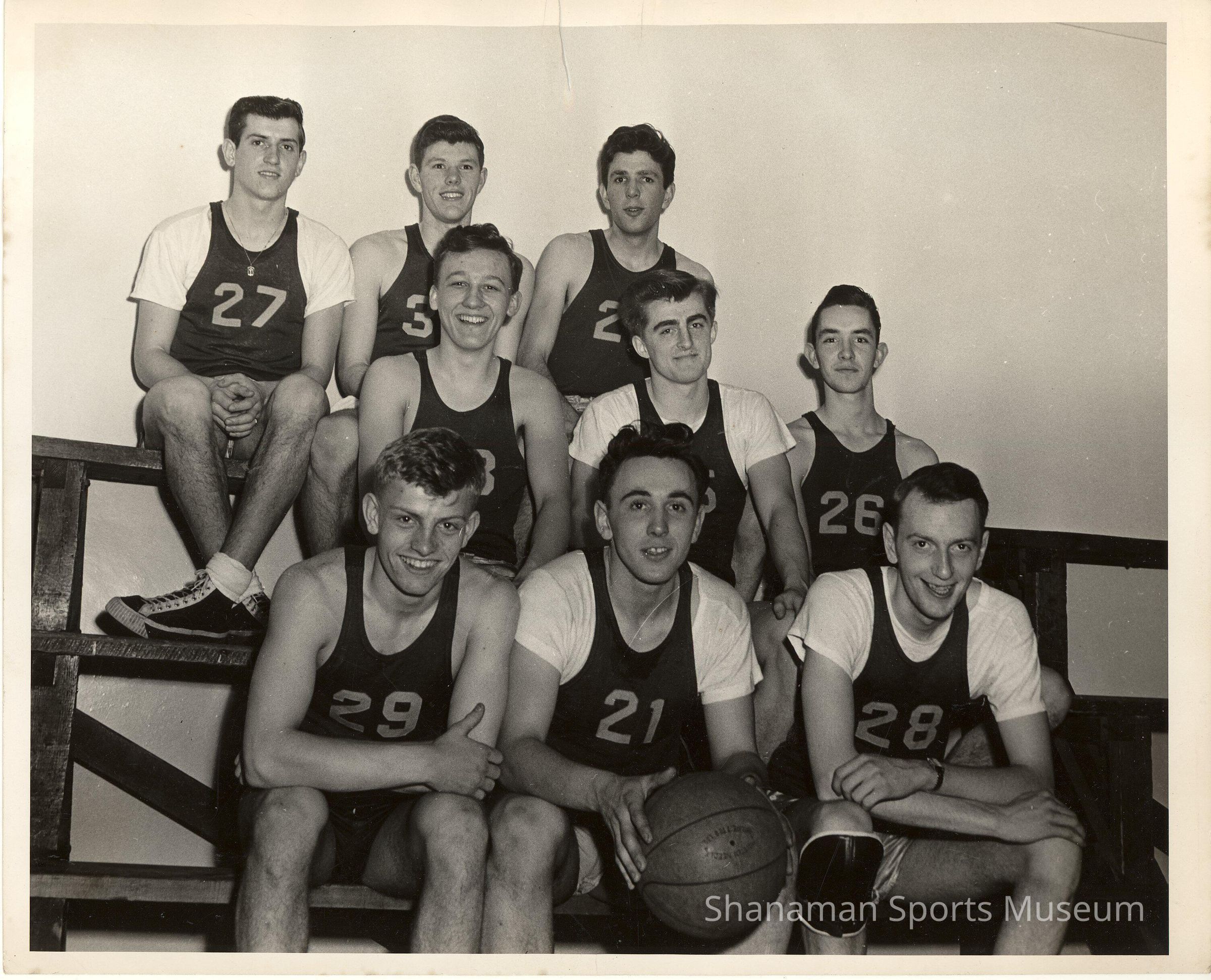 The 1949 Naval Reserve basketball team posing for a team photo. Playing competitive basketball team was a way to create camaraderie with the Naval officers during their downtime.