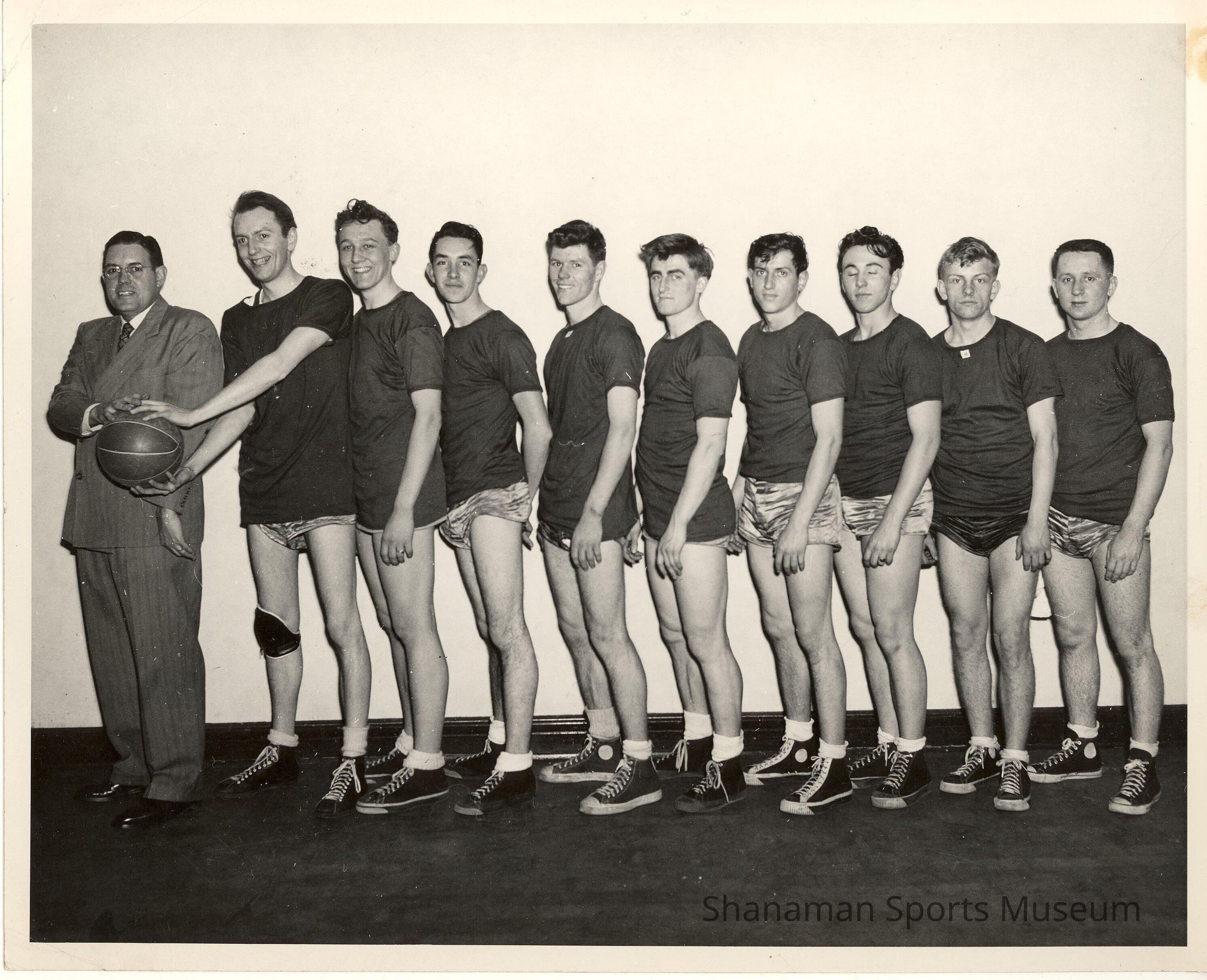 B/w photograph of the Naval Reserve basketball team, 6th from L Dale Larson, 7th from L= Jack Fabulich, 10th from L= Buster Brouillet, 1949.Relationships