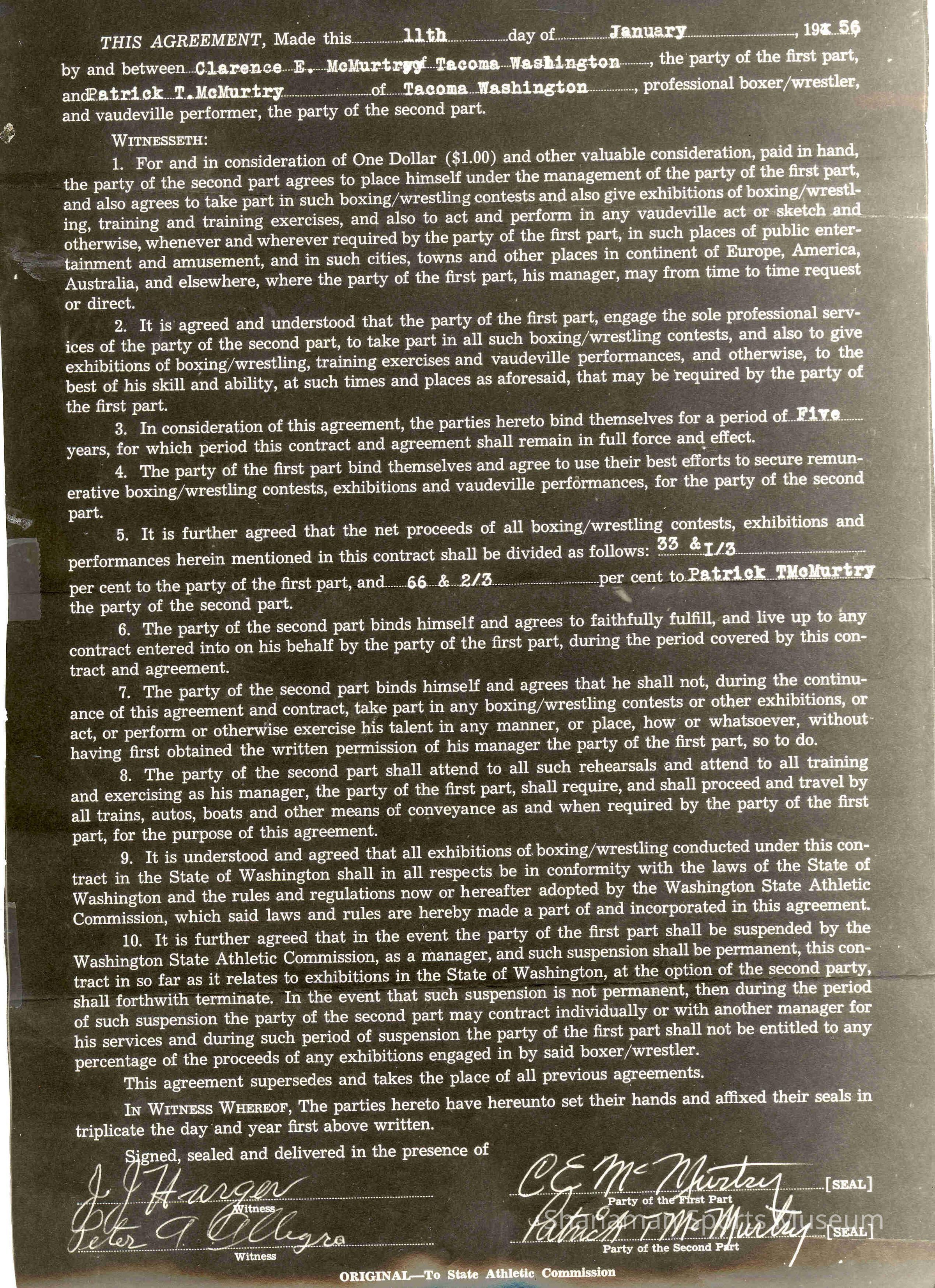 Boxer Pat McMurtry signed this contract for a pro fight back in 1956. He turned pro in 1954 and became a heavyweight contender during the late 1950s. He retired in early 1960 after he was knocked out for 17 minutes and suffered a brain injury against Eddie Machen in Portland, Ore. He then became a referee for boxing events in the Northwest and throughout the world. He finished with a 103-2 amateur record and a 33-4-1 pro record. When he retired from boxing, he sold appliances for Sears. He died April 17, 2011 from liver cancer at age 79.Lexicon
