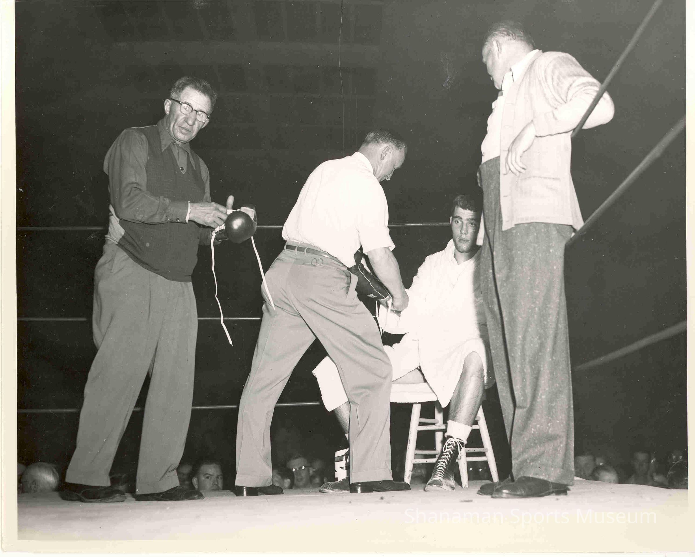 Helping McMurtry, are Pat Herman, Frankie “Chi Chi” Britt and Homer Amundsen. McMurtry later called Amundsen a great teacher and said he played a big role in his success as a boxer.