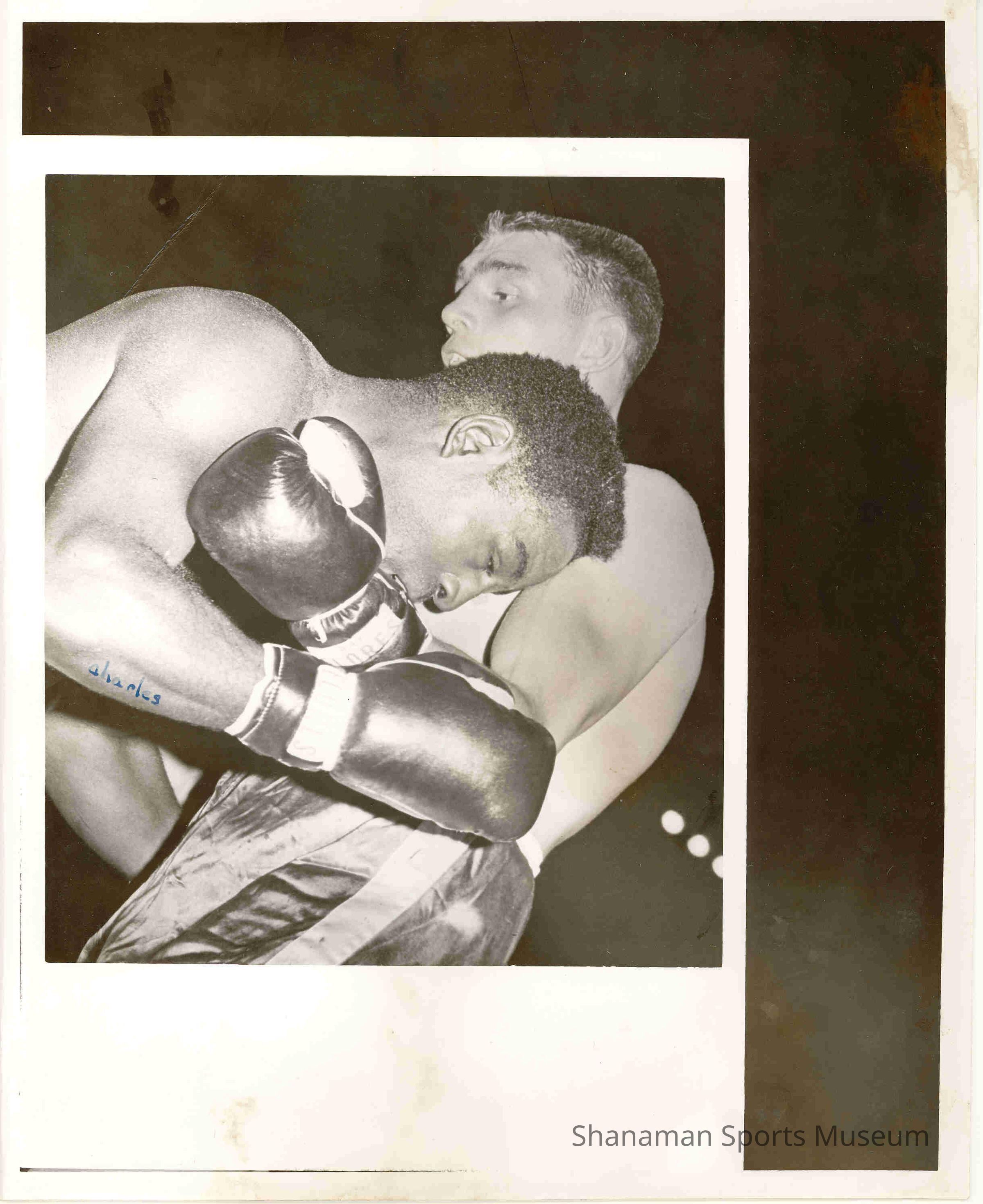 Former heavyweight champ Ezzard Charles leans into Tacoma's Pat McMurtry to deliver more body punches in this fight that occurred at Tacoma's Lincoln Bowl in July 1956. The 6-foot-1 McMurtry, in his second year as a pro, held on to win a 10-round decision against the former heavyweight champ and eventual Boxing Hall of Famer. Charles had just defeated Bob Albright in his previous fight. Albright had defeated McMurtry in the first fight between the two heavyweight contenders after McMurtry broke his hand. Out of desperation, Charles hit McMurtry low in the sixth and seventh rounds, but McMurtry hung on to win. McMurtry's win against Charles was one of his biggest paydays as he made $20,500. The win helped him rise to fifth in the world, his highest ranking.Made/Created