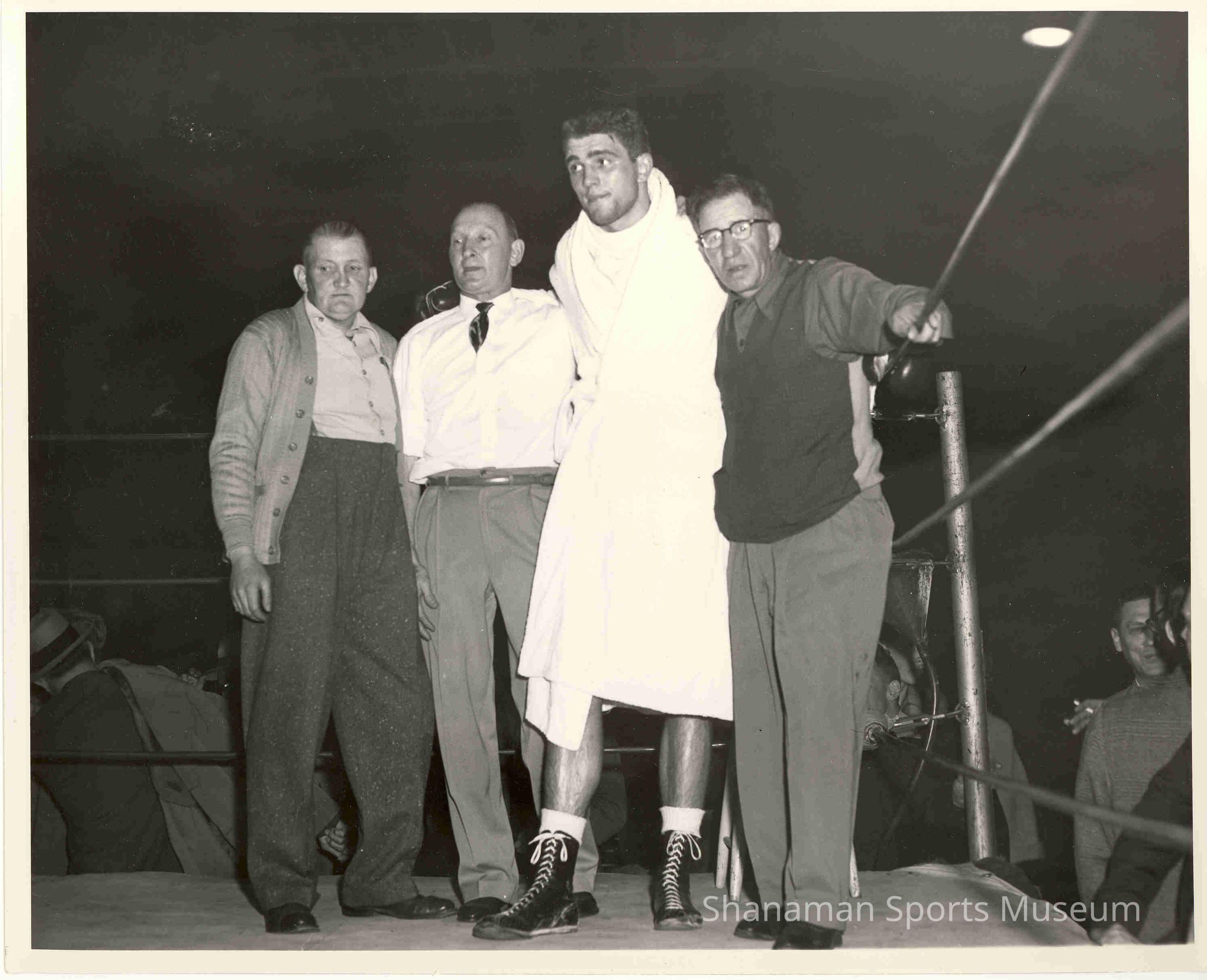 Huddled together and waiting on the judges decision after "Irish" Pat McMurtry's, second right, 10-round bout with Willie Pastrano in front of a crowd of 11,000 spectators at the Lincoln Bowl in Tacoma on August 24, 1956. Pastrano won the bout by unanimous decision, and even though he lost, the match helped launch McMurtry into the national spotlight. Alongside McMurtry, starting from the left, are his manager Homer Amundsen, Peter Herman and Frank "Chi Chi" Britt.Made/Created