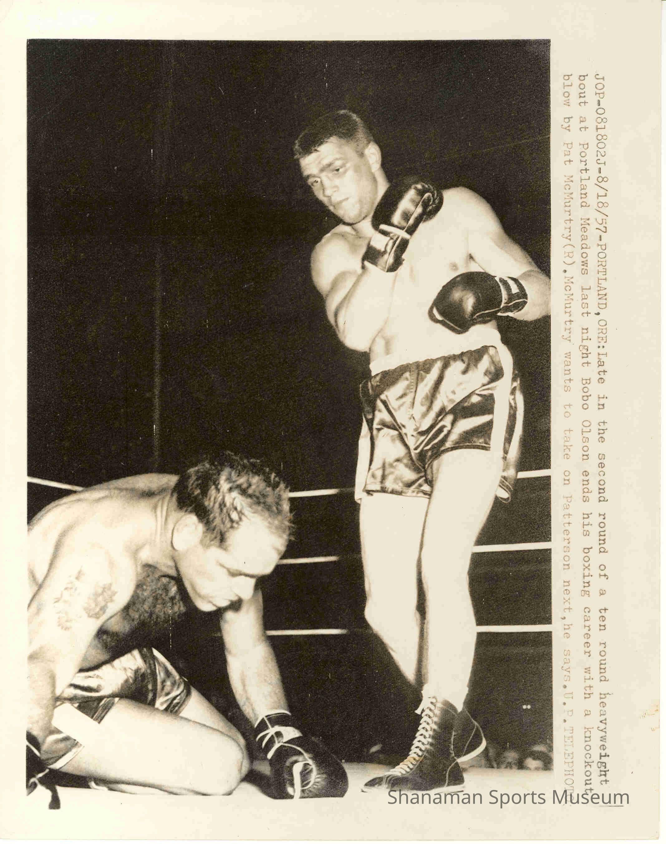 Tacoma's Pat McMurtry knocks down Bobo Olson in a pro fight back in 1957 at Portland Meadows. McMurtry won by a second-round knockout. Olson was the world middleweight champ between October 1953 and December 1955, which is the longest reign of any champ in that division during the 1950s. McMurtry, who was born in Tacoma in 1932 and graduated from Lincoln High School, didn't lose in his first 16 pro fights and finished with a 33-4-1 record as a pro.Made/Created