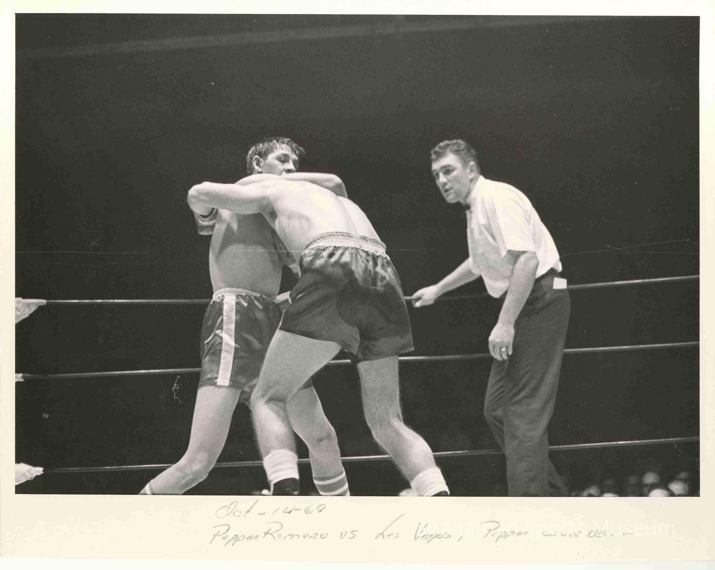 Pat McMurtry referees a fight involving Pepper Romero on Oct. 14, 1968 in Las Vegas. McMutry's boxing career ended in October 1959 in a fight in Portland against Eddie Nachen, who was a powerhouse puncher and his only pro loss was to Ingemar Johansson. McMurtry was decked several times in the first round and when he struggled to get up the fight was over at 2:11 of the first round. He was knocked out for 17 minutes. Neurological exams afterward showed that McMurtry had suffered permanent brain damage, which affected his balance for the rest of his life. But McMurtry didn't say goodbye to boxing and he continued to referee.Lexicon