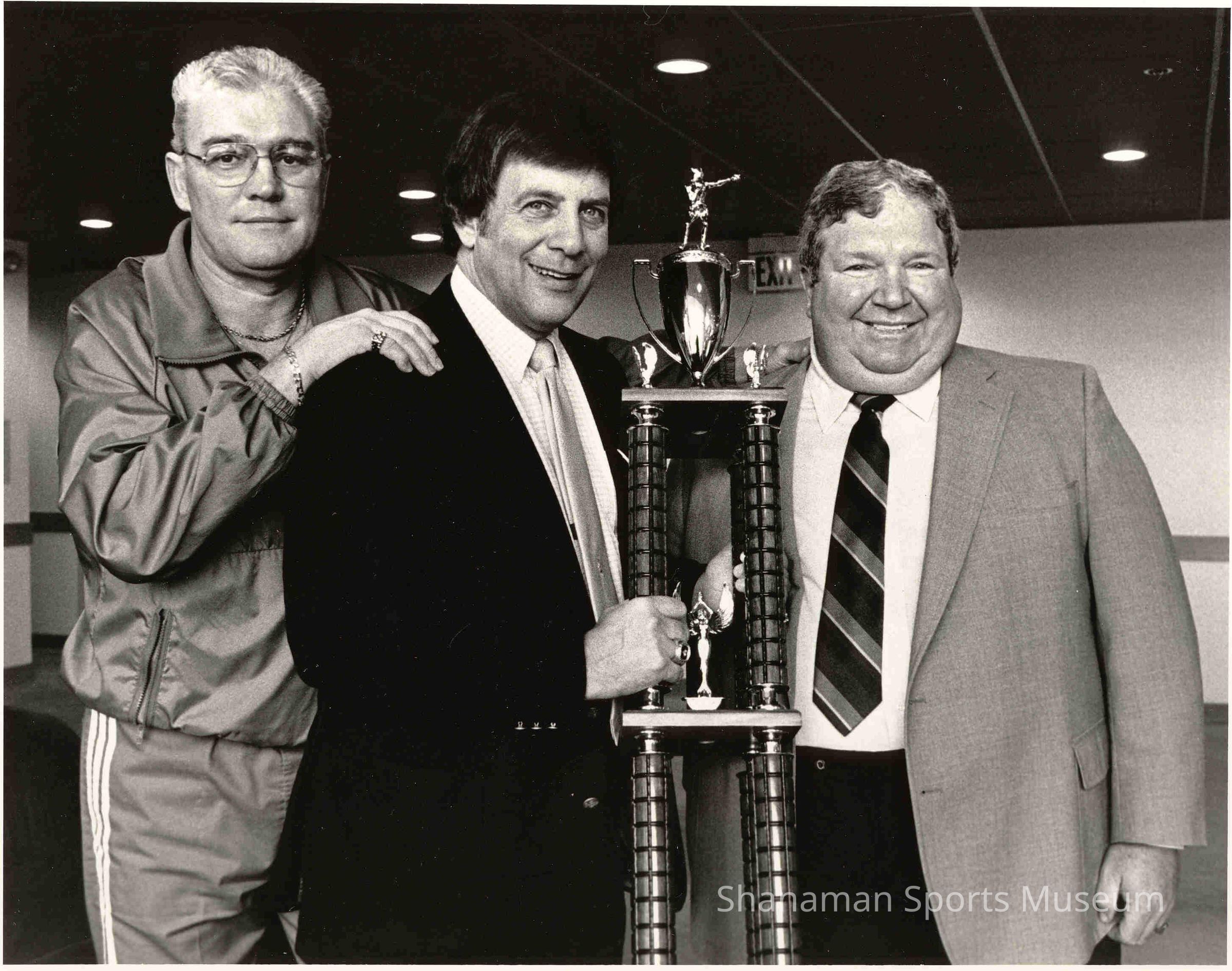 Pat McMurtry (left) poses for a photo with Stan Naccarato, who is holding a boxing trophy and standing next to another unidentified man. After McMurtry's successful professional boxing career ended after getting knocked out in a fight in October 1959, he became a referee for amateur and professional boxing matches for many years. Naccarato, who played minor league baseball as a young man, was one of the most influential people in shaping sports in Tacoma. He was a successful businessman who loved sports. In 1971, Naccarato led the effort to save Class Triple A baseball in Tacoma.Lexicon