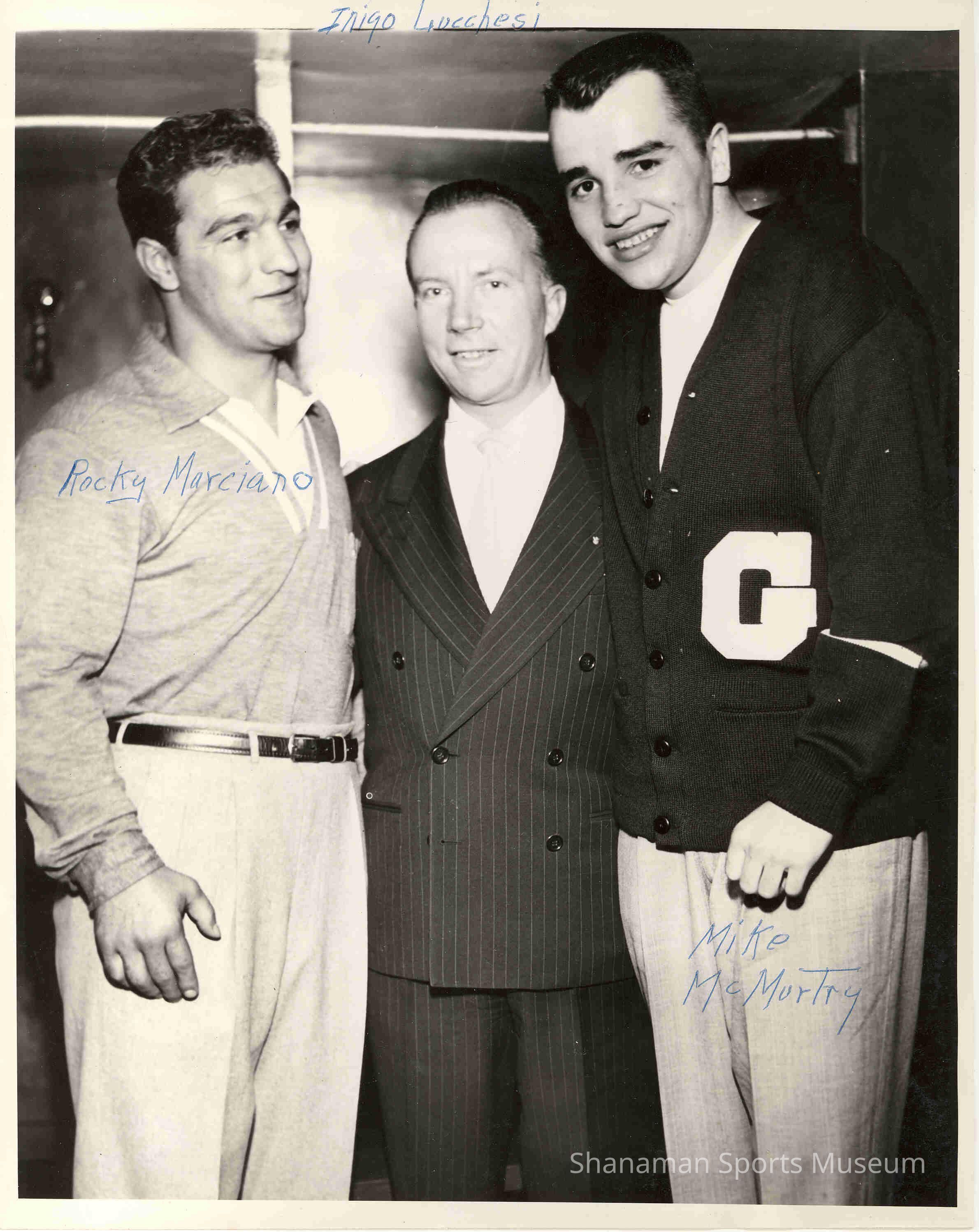 Tacoma's Mike McMurtry (right), stands with boxing legend Rocky Marciano (left) and Inigo Lucchesi. Marciano held the world heavyweight title from 1952 to 1956 and is the only heavyweight champ to retire undefeated. He won all six of his title defenses. McMurtry won a NCAA heavyweight title while boxing at Idaho State and finished with an impressive amateur career of 207-7. Lucchesi, who was born in Italy in 1909, became a successful boxing promoter in the 1950s and 1960s after selling his tavern in Tacoma.Lexicon