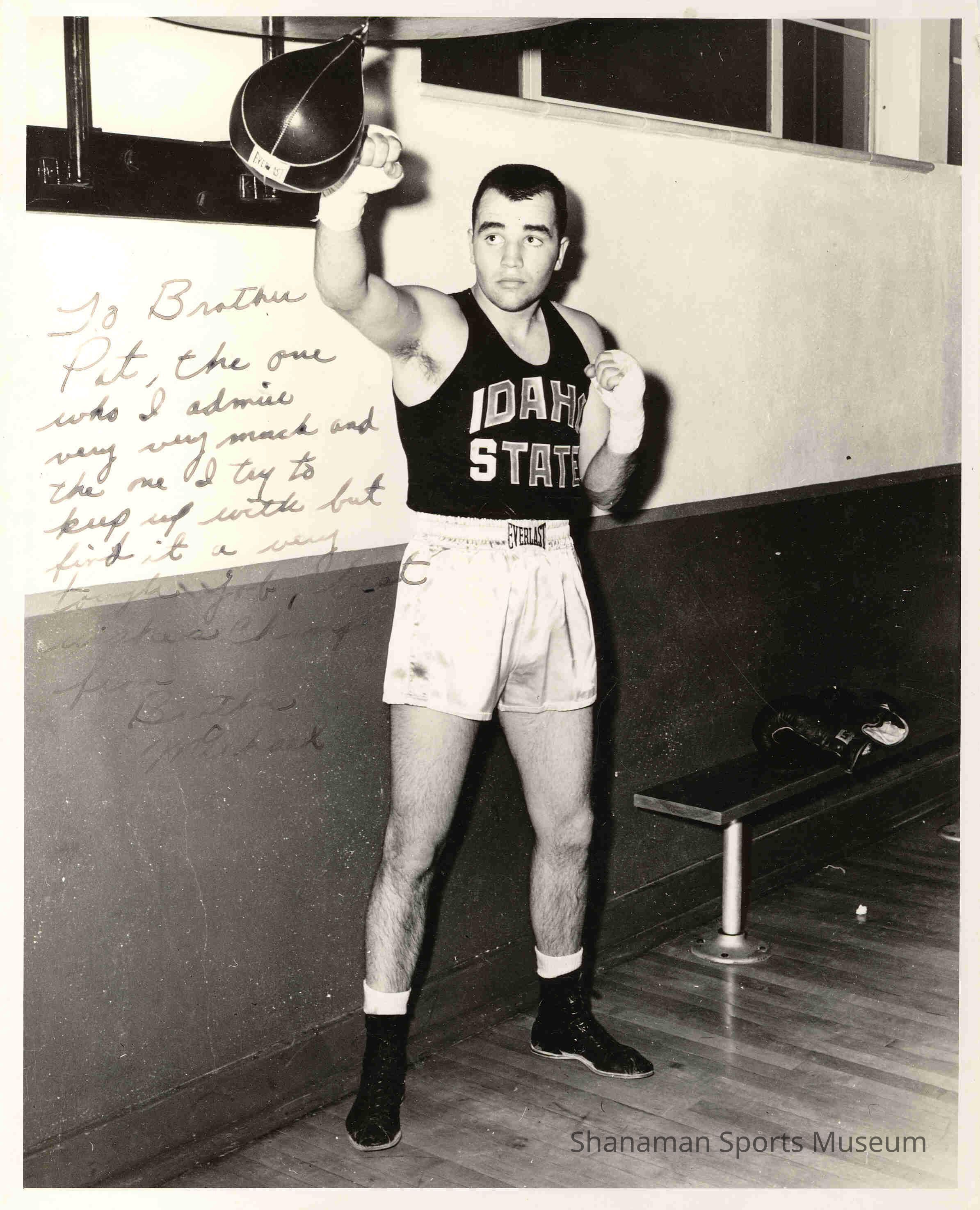 Mike McMurtry is wearing his Idaho State shirt where he was the NCAA heavyweight champion while attending school there in the 1950s. On the photo, Mike wrote to his brother, Pat, who was a professional heavyweight fighter: “To brother Pat, the one who I admire very, very much and the one I try to keep up with but find it a very tough job. Best wishes champ, from Brother Michael.” The two McMurtry brothers are considered to be among the best boxers to come out of Tacoma. They have both been inducted into the Tacoma-Pierce Country Sports Hall of Fame.Lexicon