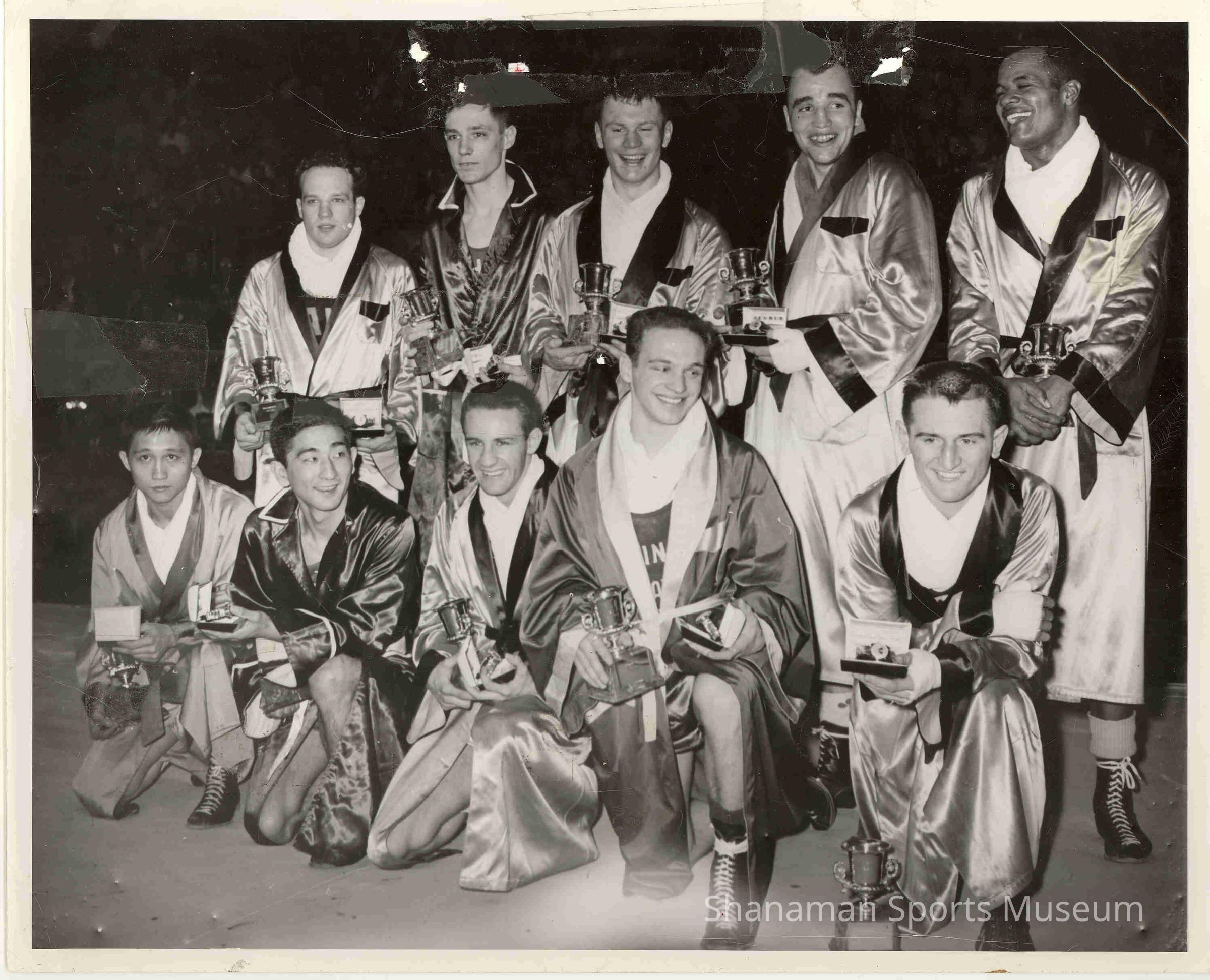 Tacoma's Mike McMurtry (second from the right on the top row) stands among the winners of their weight class at a boxing tournament. While attending Idaho State, McMurtry won the NCAA heavyweight title, beating a previously undefeated Bod Hinds to win the 1954 championship. He was inducted into Idaho State University's Hall of Fame in 1981. McMurtry had a triumphant amateur career, losing only seven times in 214 fights.Lexicon