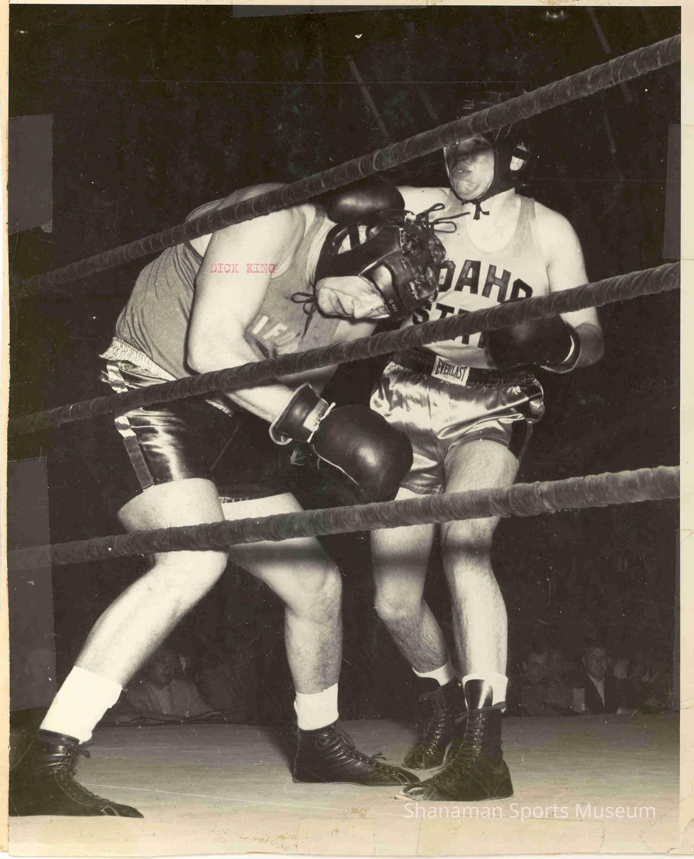 While boxing for Idaho State College in the 1950s, Mike McMurtry throws a combination of punches as his opponent Dick King of the University of California buckles over for protection near the ropes. McMurtry, who started boxing at a young age growing up in Tacoma and attended Lincoln High School, was a dominate boxer in college and ended up winning the NCAA heavyweight title in 1954 and qualified for the NCAA tournament four times.