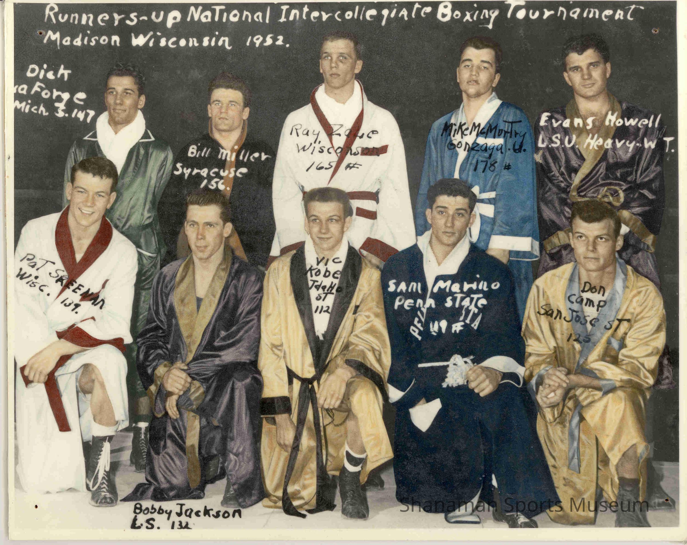Tacoma's Mike McMurtry (back row, second from right) stands in this photo taken of the runner-ups in their weight class at the 1952 National Intercollegiate boxing tournament in Madison, Wisconsin. McMurtry is considered to be one of the top boxers to come out of Tacoma and had a impressive amateur career. He fought an incredible 214 amateur bouts, losing only seven. After college he joined the Marines and continued to box. Then in 1959, McMurtry fought his first pro fight, facing Ken Kass at Seattle's Sick's Stadium. McMurtry suffered a head injury in that bout, ending his career. That fight was a preliminary bout that day to his older brother's fight. His older brother, Pat McMurtry, boxed professionally and fought in several heavyweight championship bouts.