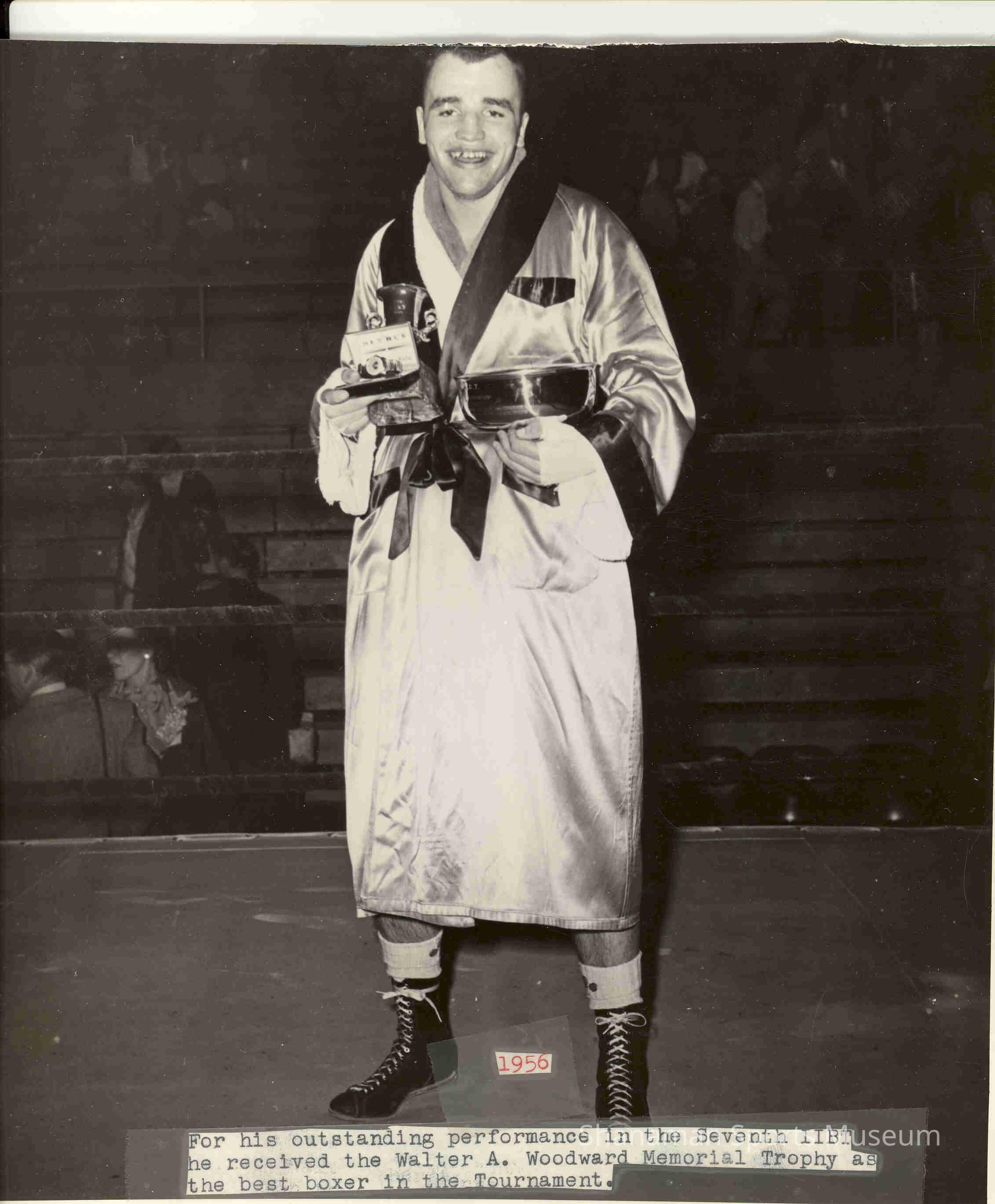Tacoma's Mike McMurtry receives the Walter A. Woodard Memorial Trophy as the best boxer in the Seventh IIBT tournament in 1956. Mike and his older brother Pat were introduced to boxing when they were five and seven years old. Their father, Clarence, who was a former amateur boxer, gave his sons boxing gloves for Christmas when they were kids. McMurtry had a successful 12-year amateur boxing career, finishing with a 207-7 record and winning a NCAA title in 1954 while attending Idaho State College.Lexicon