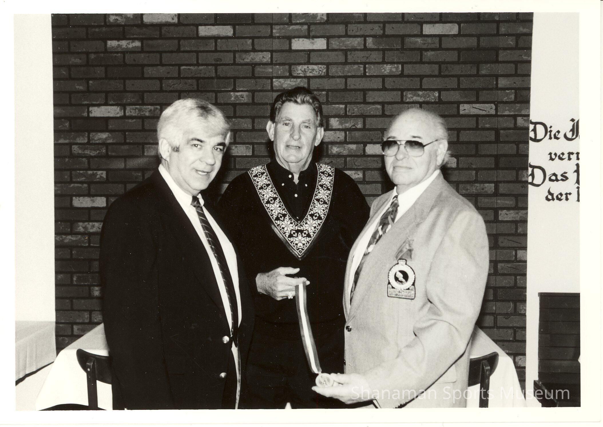 B/w Photo, 4x6" Three men, one in center holding medal, Morris McCallum on right. TAC.Relationships