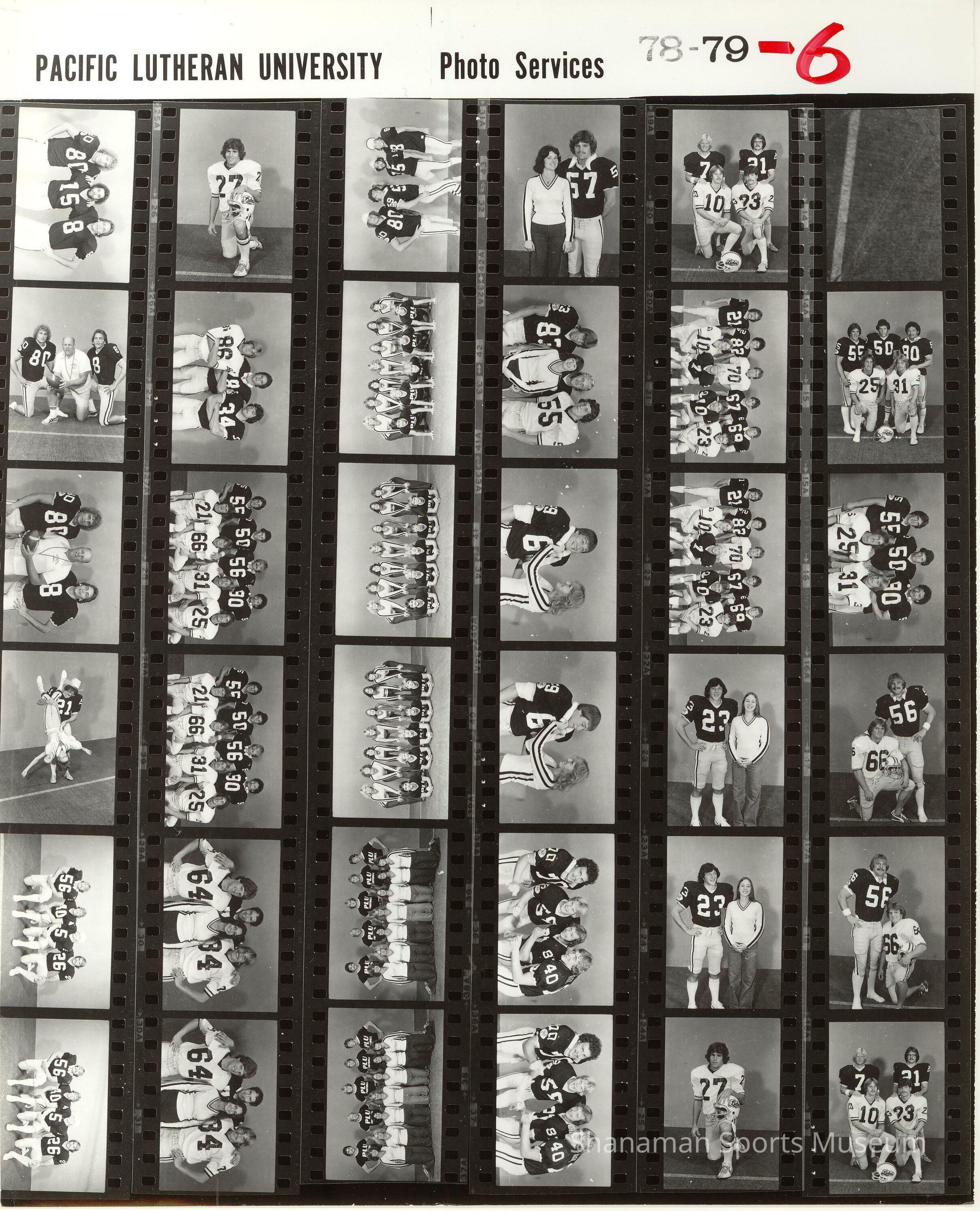 30 photo negatives of individual and group shots for the Pacific Lutheran University football team for the 1978-79 season.