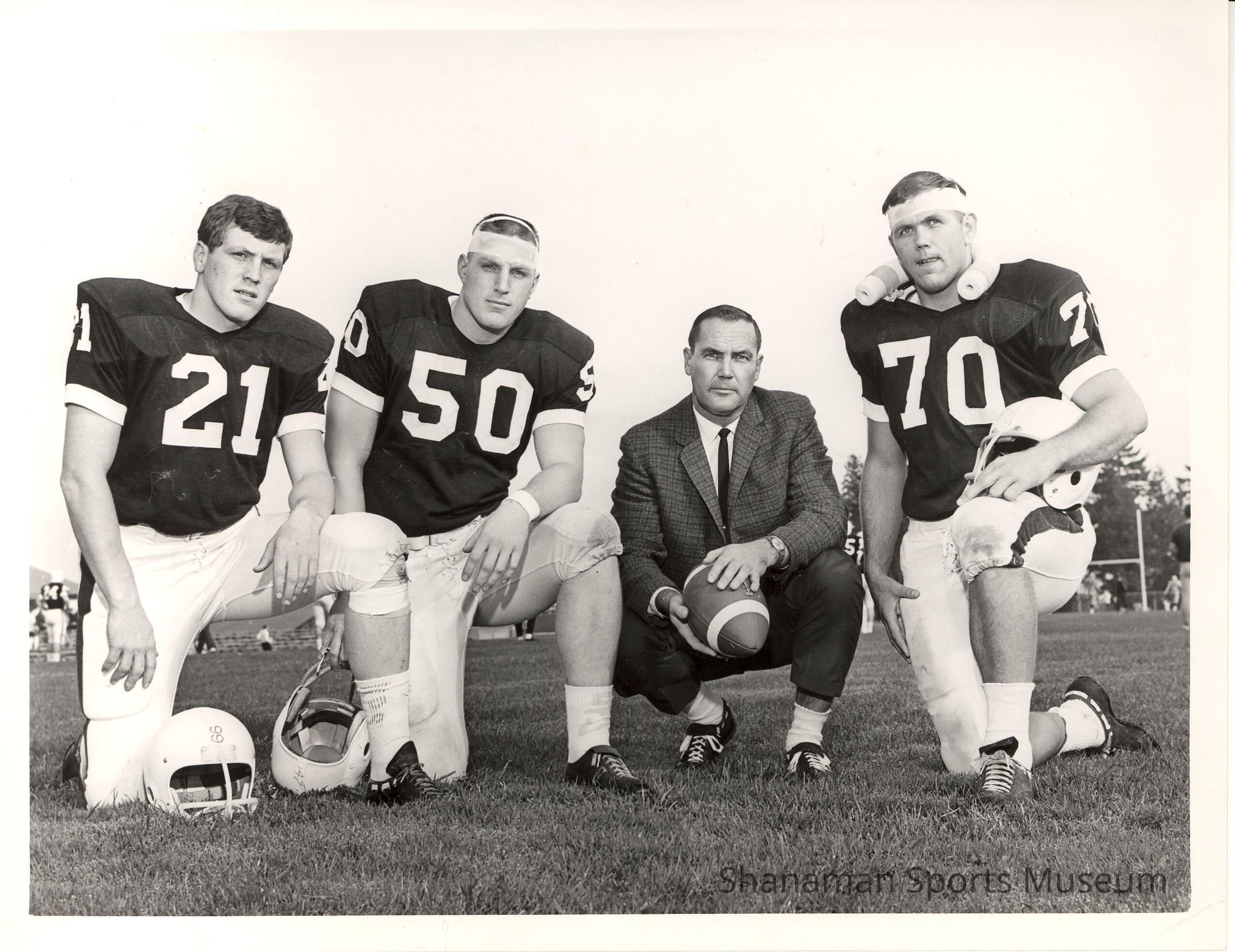 First-year University of Puget Sound head coach Bob Ryan in 1965, poses with senior players Loren Wall ('21), team capatain Andy Pazaruski ('50), and Jim Gunderson ('70).
