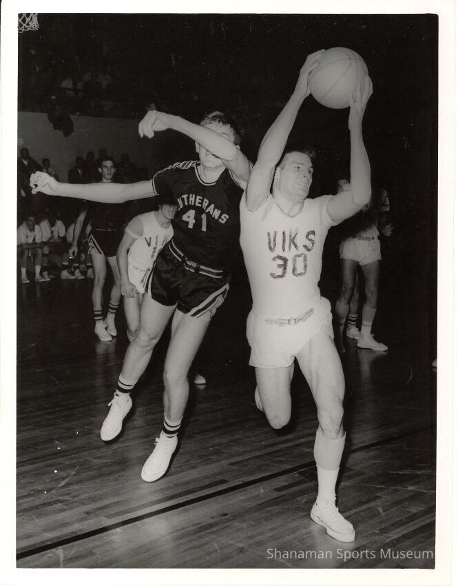Two college basketball players, believed to be from Western Washington University (No. 30 in the white jersey with "Viks" on the front) and Pacific Lutheran University (No. 41 in the dark jersey with "Lutherans" on the front) battle for the ball in an undated photograph.
