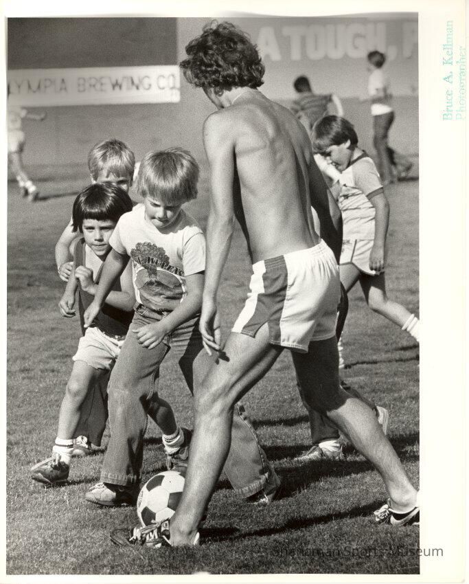 B/w photo, 8x10", Mark Peterson shows children how to kick the soccer ball.