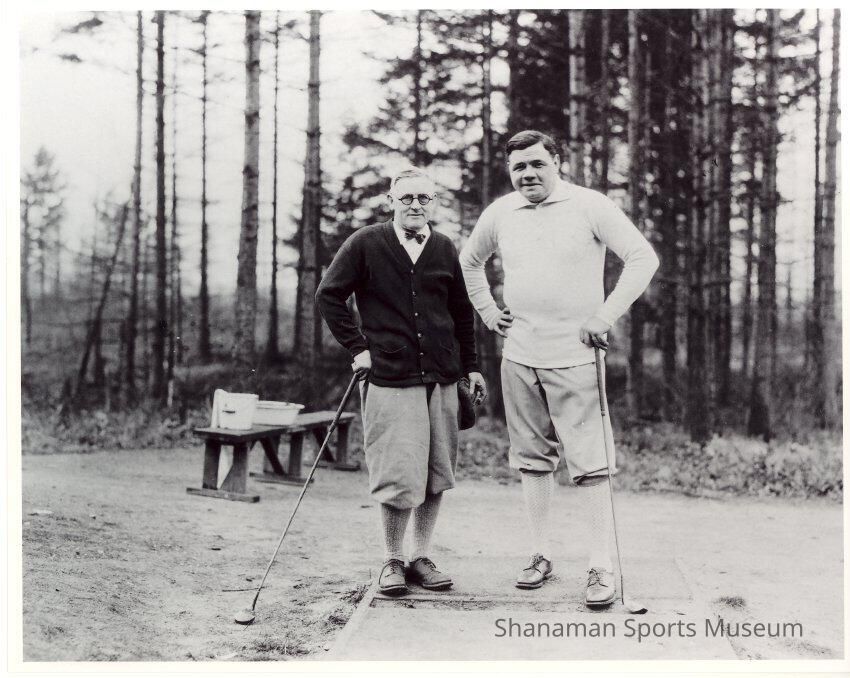 Baseball legend Babe Ruth of the New York Yankees, right, poses with Dr. W.B. Burns at Fircrest Golf Club in December 1926. Ruth played two rounds at Fircrest and was photographed along with Burns and three others in the Dec. 12, 1926 edition of the Tacoma Sunday Ledger getting ready to sink a putt for a birdie.