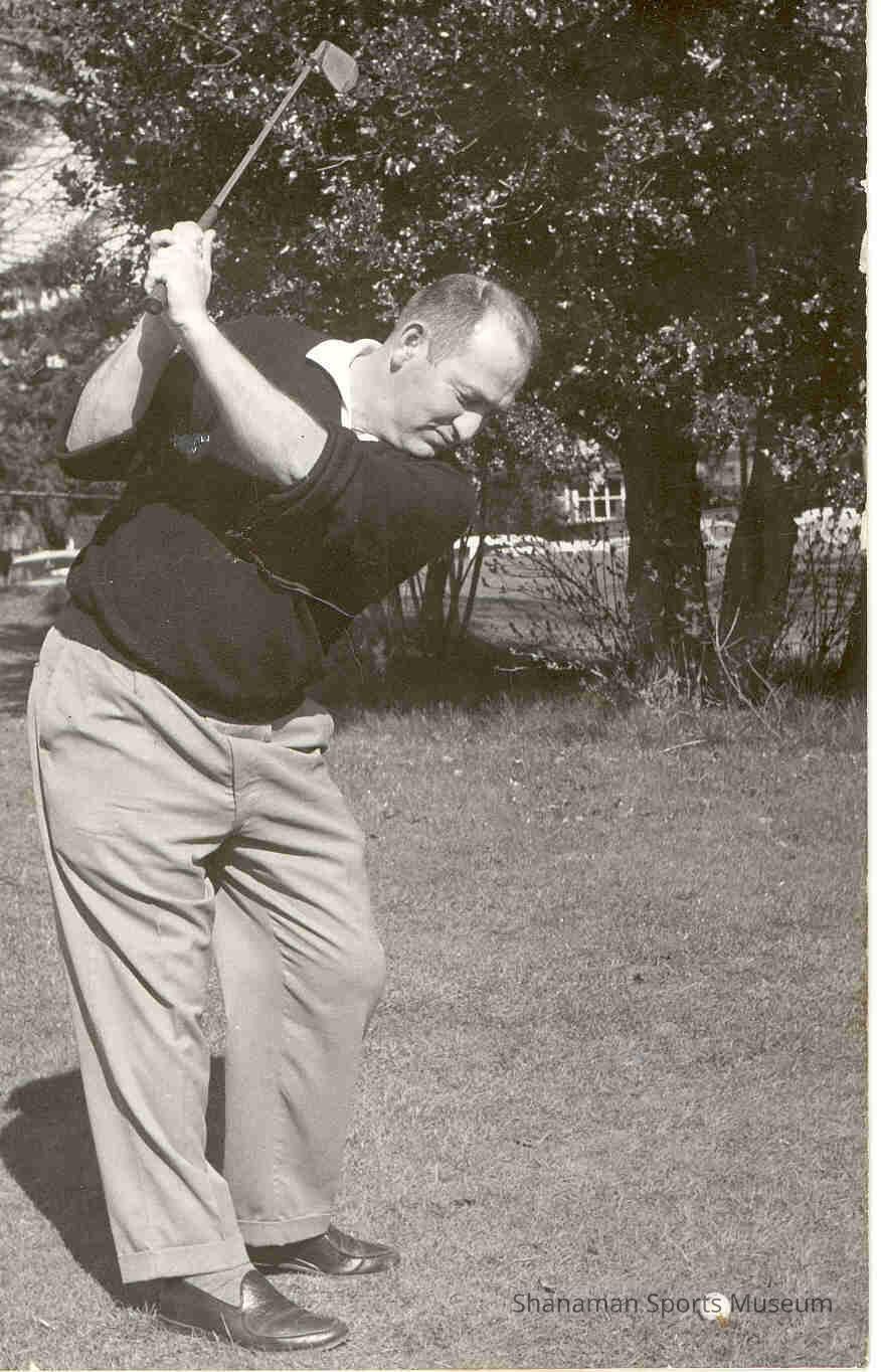 Oscar “Ockie” Eliason is captured during his backswing. He became a professional golfer in 1947 after winning the 1946 Tacoma City Amateur. Eliason went on to become one of the best Northwest golfers for more than 20 years. In 1967 Eliason became the head professional at Allenmore Golf Course in Tacoma where he remained until 1987. During that time he served as an instructor to Ken Still and Doug Campbell, who both went on to play on the PGA Tour. Among his credits, Eliason won the Allenmore Open in 1950, back-to-back Northwest Open championships in 1955-56 and won the Oregon Open and finished second in the Northwest Open. In 1988 Eliason won the Pacific Northwest Senior PGA Match Play championship. Eliason was inducted into the PGA Pacific Northwest Section Hall of Fame as well as the Tacome-Pierce County Sports Hall of Fame. Photo donated by Marc Blau.