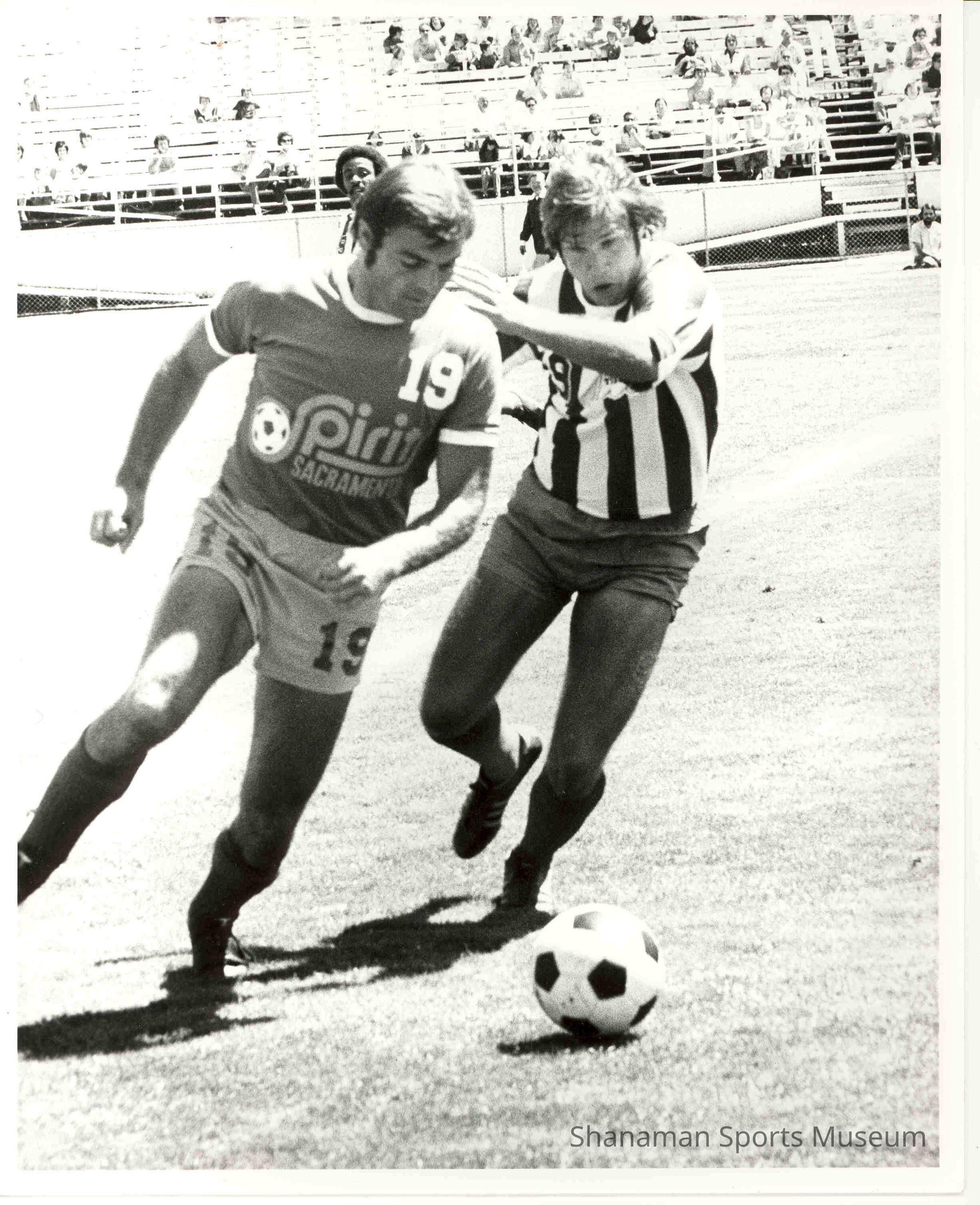 B/w action photograph of the 1976 Tacoma Tides soccer team.