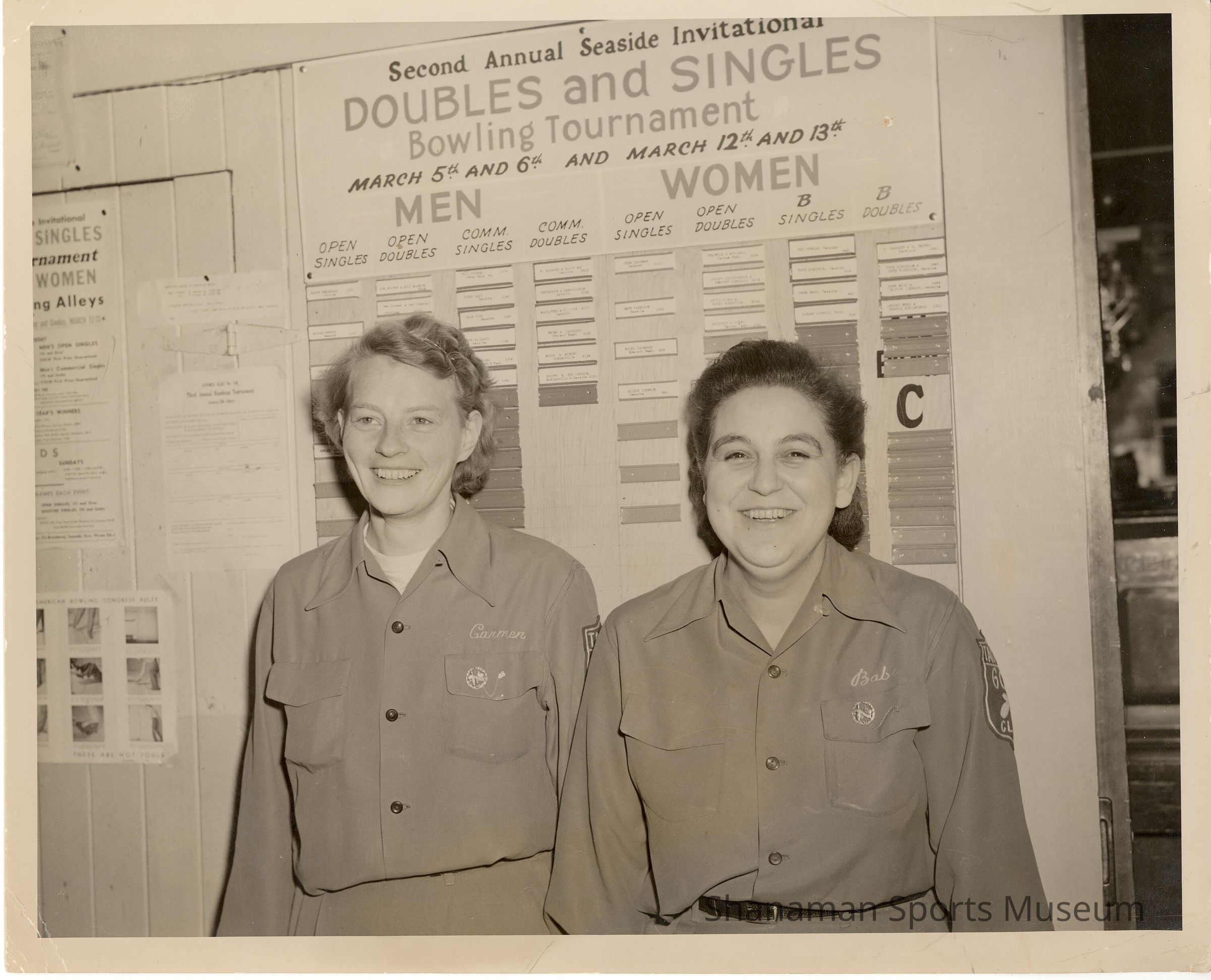 Back in the 1940s, a gleeful Carmen Mitchell (left) and Babe Penowich (right) stand in front of a tournament standings board for a local bowling tournament. Penowich competed in a WIBC bowling tournament in St. Paul in 1950. Bowling was a popular sport for women back in the 1940s, 50s and 60s.Lexicon