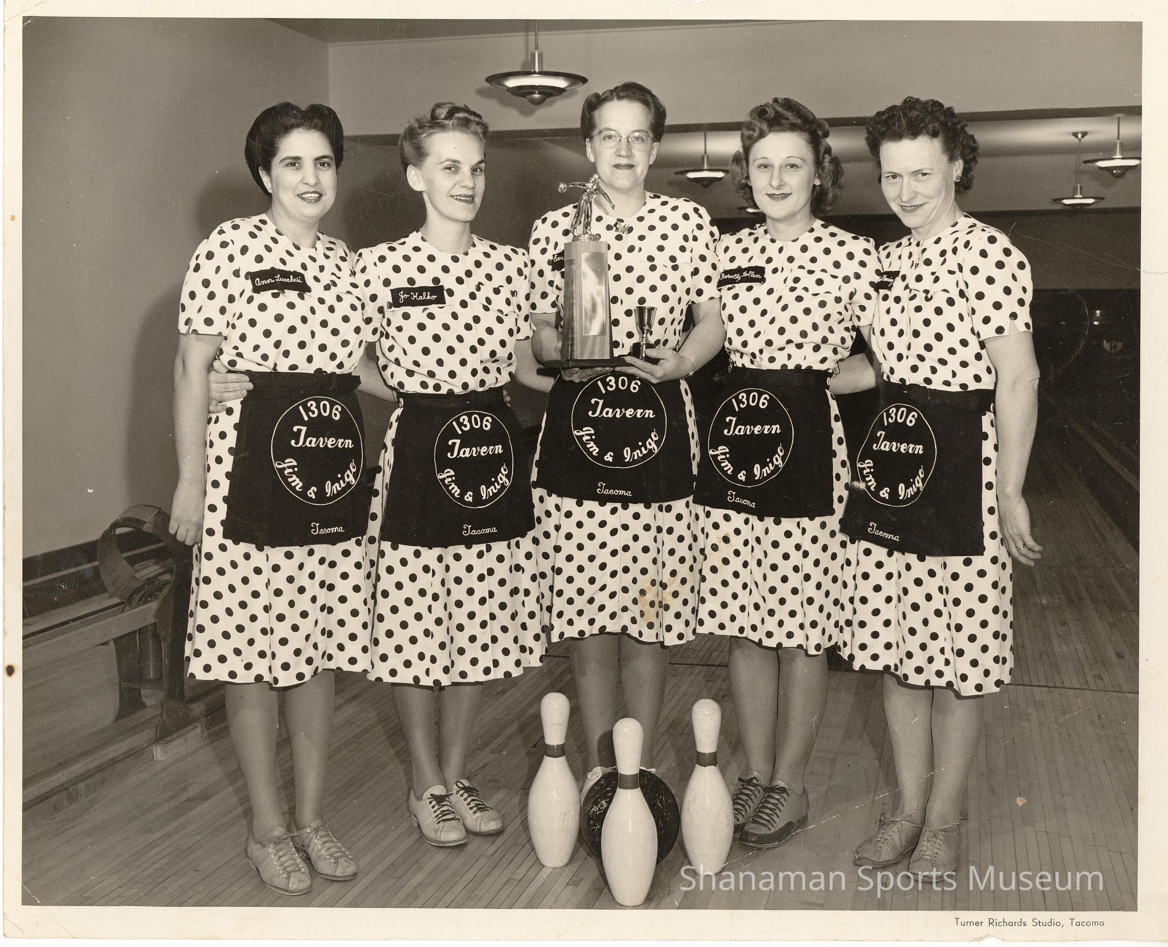 In the 1940s, these five women were on the 1306 Jim & Inigo Tavern women's bowling team. They're wearing matching polka dotted dresses and aprons. From left to right, they are Ann Lucchesi, Jo Halko, Eyelyn Stein, Dorothy Pollen and Mildred Fleming.