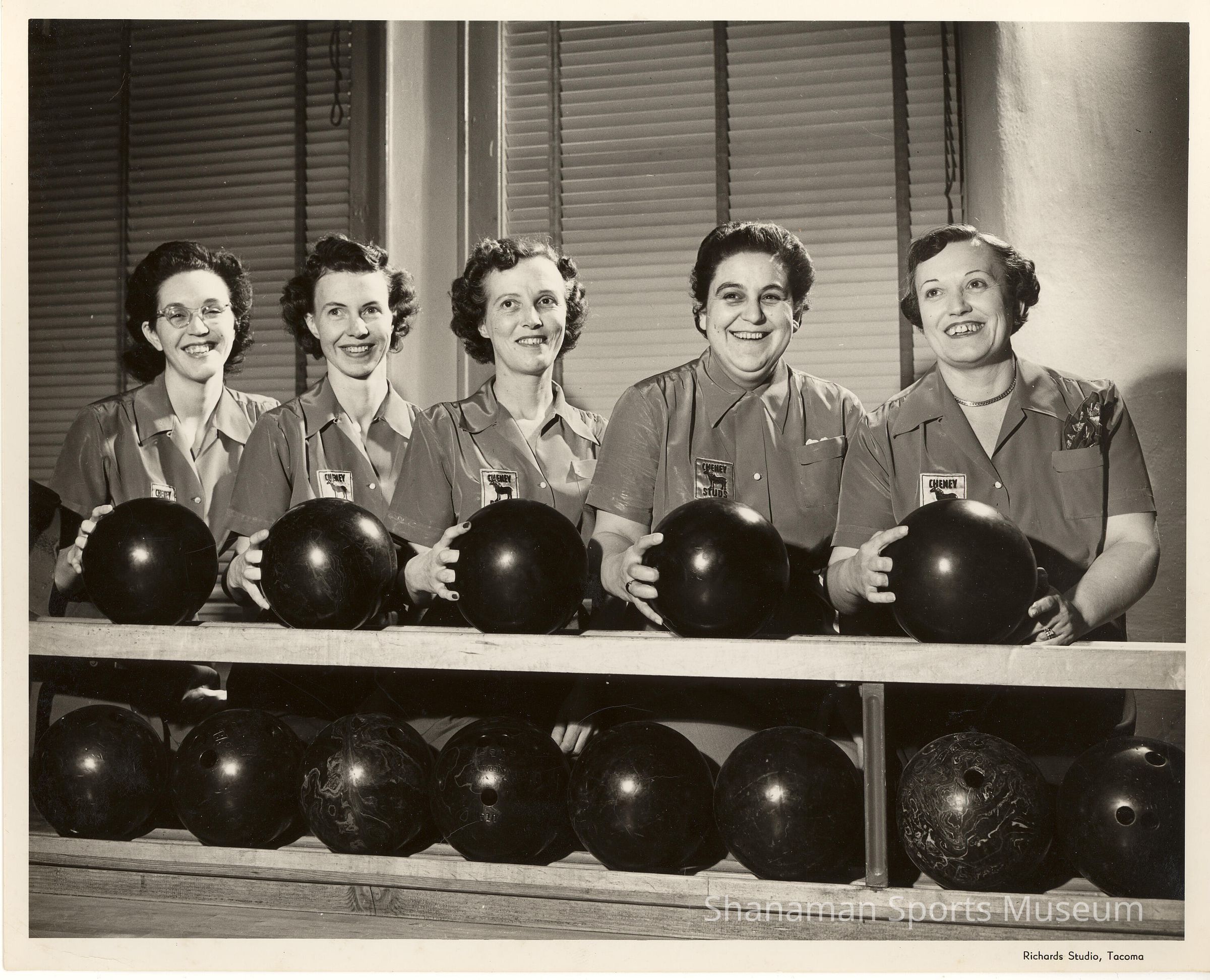 Standing next to a bowling ball rack, Jackie Pagni (on the left) and Stella Babe Penowich (second on the right) pose for a picture with three other women. Penowich was a frequent competitor in local and national tournaments. In 1950, she competed in the WIBC bowling tournament in St. Paul. She was on the women's all-star team 18 times. In 1953, 1956 and 1957, Penowich had the highest average in the state. Her best series was 689. In 2006, Penowich was inducted into Tacoma's Sports Hall of Fame.Lexicon