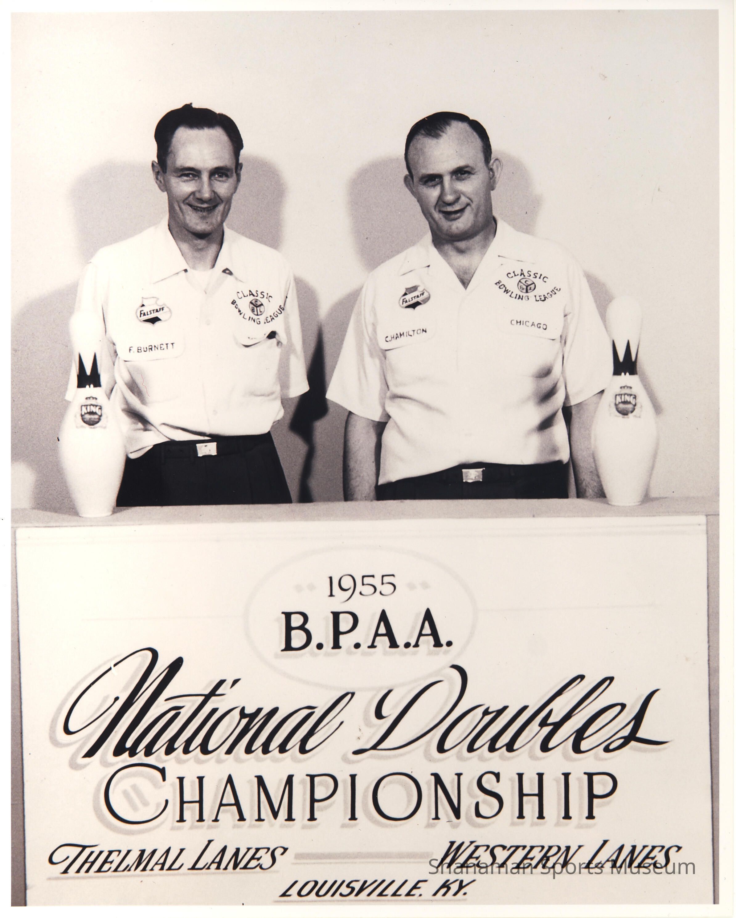 Frisco Burnett (left) and Chuck Hamilton smile for a black-and-white photo taken at the 1955 B.P.A.A. National Doubles Bowling Championship. Burnett is considered to be one of the top bowlers to come out of Tacoma. He was inducted into the Greater Tacoma Bowl Association Hall of Fame in 1966, the American Bowling Congress' Hall of Fame in 1969 and in the Tacoma Sports Museum's Hall of Fame in 2008. Burnett and Hamilton teamed up for doubles for many bowling tournaments. Hamilton, who was stationed at McChord Air Force Base in the 1950s, was an avid bowler and wrote a bowling column for 28 years.Lexicon