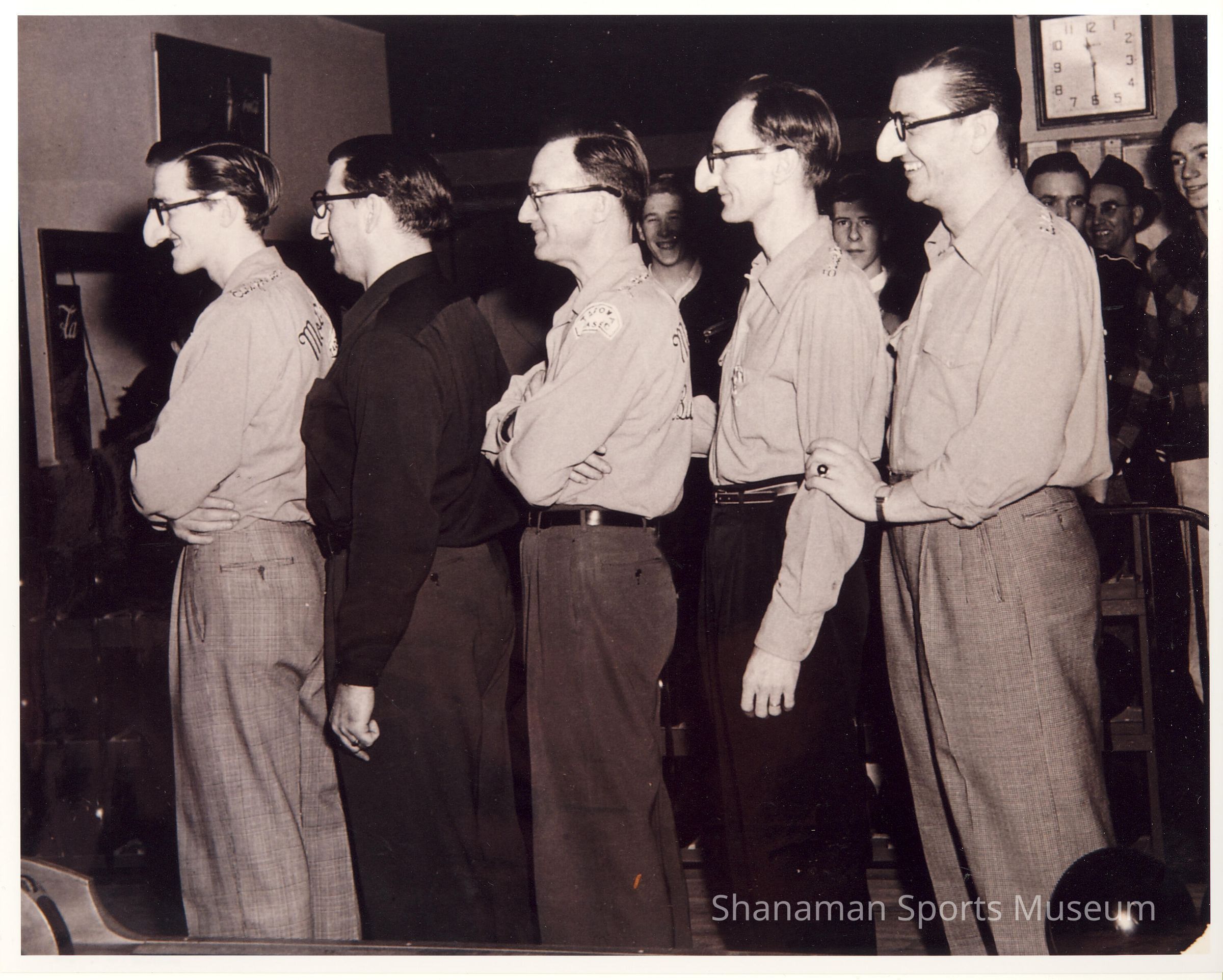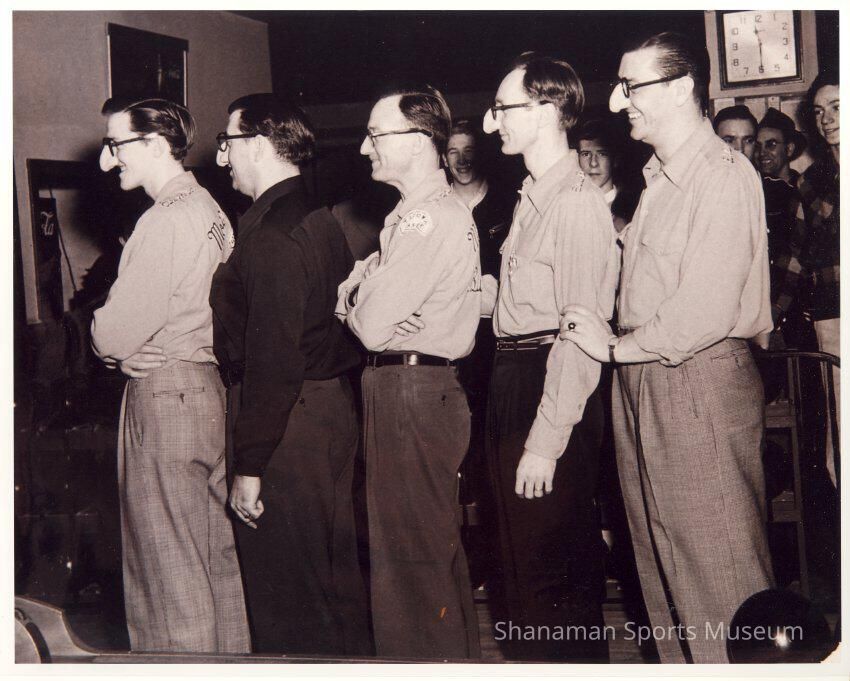 Wearing fake glasses with fake noses and fake mustaches, Frisco Burnett stands with his bowling team, posing for a funny photo. But there was nothing fake about Burnett's bowling game. Over a bowling career that lasted just over 20 years, Burnett averaged 204 and rolled six perfect 300 games and bowled 27 series over 700. He was inducted to three halls of fame.Lexicon