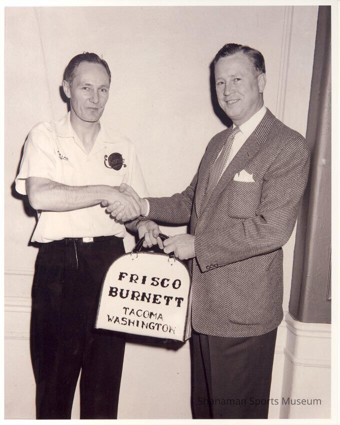 Frisco Burnett shakes hands and accepts a bowling bag with his name on it. Burnett is considered to be one of the best bowlers to come out of Tacoma and was inducted into the American Bowling Congress Hall of Fame in 1969 and the Tacoma Sports Hall of Fame in 2008. At 5-foot-11 and 155 pounds, Burnett averaged 204 for his lengthy career and bowled six perfect 300 games and 27 series over 700.Lexicon