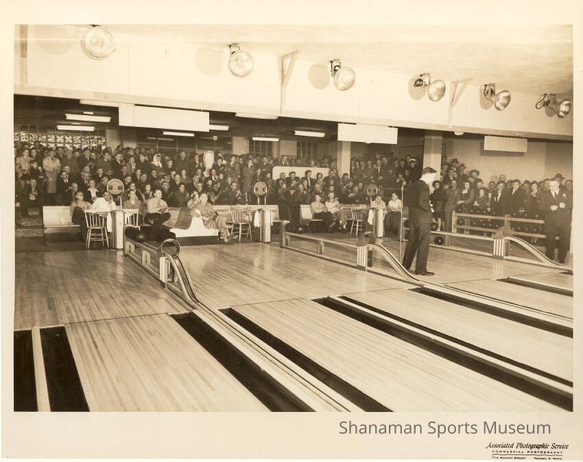 With a large crowd watching, Frisco Burnett and other bowlers get ready to begin a tournament. During Burnett's successful bowling career that began in 1942, he was a four-time selection to the All-West Coast team, an eight-time qualifier for the National All-Star tournament and he was inducted into the American Bowling Congress' Hall of Fame in 1969, seven years after he died in a car wreck in Portland, Oregon.Lexicon