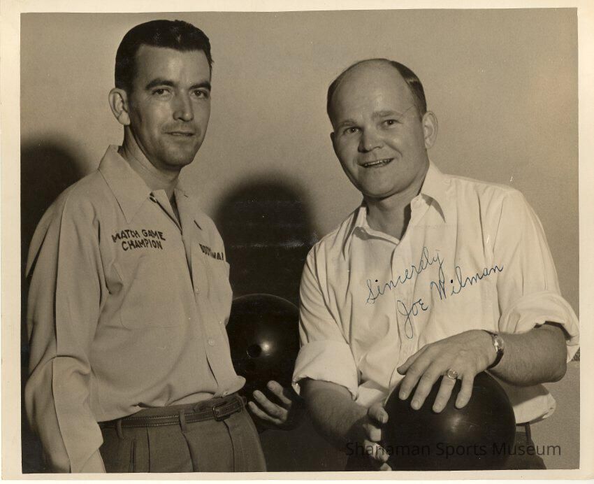 Joe Wilson (right) and Buddy Bomar smile for a photo holding their bowling ball. Wilson, who autographed the photo, was a popular color commentator on TV's nationwide telecasts of PBA bowling tournaments in the 1950s and 1960s. The photo was donated by Bernice Burnett, wife of Frisco Burnett, a Tacoma bowler who placed well at national bowling tournaments over the years. Autographed by Joe Wilson.Lexicon