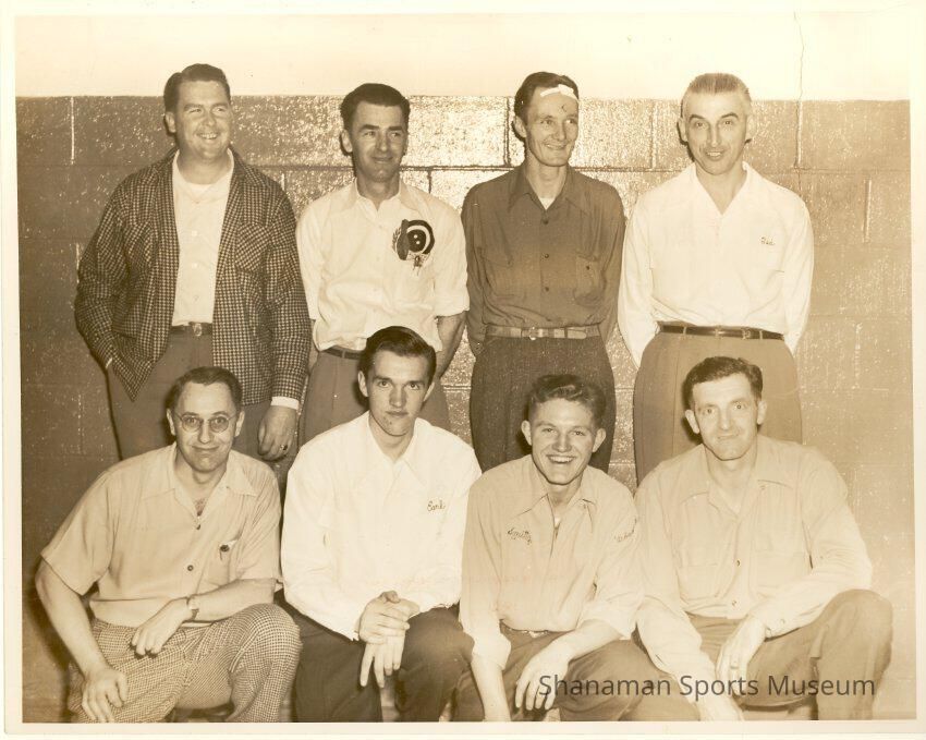 In this black-and-white photo taken in the 1940s, there are some of the top bowlers in the history of the Tacoma bowling leagues. Among them is Earl Johnson, a long-time PBA member and a five-time PBA tour titlist who was inducted into the ABC Hall of Fame in 1987. Standing in the front row of the picture from left to right are Red Wakefield, Bill Eggleston, Frisco Burnett, Ted Tadich. Kneeling are: unknown, Earl Johnson, Urban Schmidt, Primo or John Artoe. Johnson said he helped perfect his PBA game levels by watching Tadich and Burnett bowl.