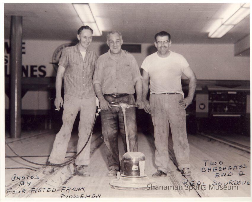 Frisco Burnett (left) stands with two other men sanding a bowling alley in Tacoma. Burnett is considered to be one of the top bowlers to come out of Tacoma. He was inducted into the Tacoma Sports Hall of Fame in 2008 and the American Bowling Congress' Hall of Fame in 1969. Burnett was a four-time selection to the All-West-Coast team. At the bottom of the photo, someone wrote “Two checkakos and a real sourdour” on the bottom right. "Photos by Four Fisted Frank Fuddleman" handwritten in bottom left.Lexicon