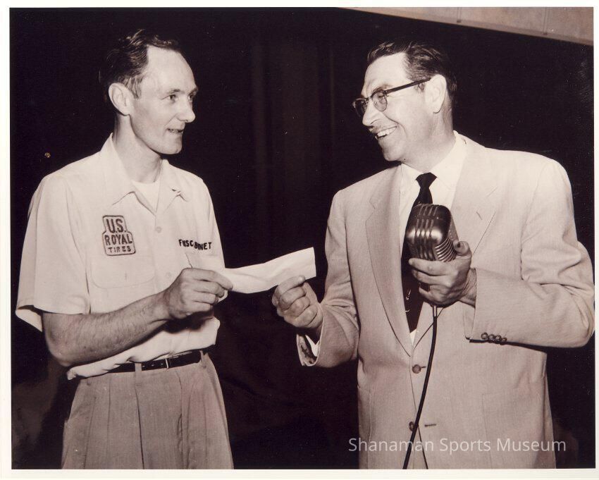 After placing well in another bowling tournament, Frisco Burnett (left) receives a check for prize money. In December 1951, Burnett finished 10th in the World Series of Bowling in Chicago where 160 of the nation's top bowlers competed. He received $275 in prize money. Up to that point, he was the only bowler from the Northwest to have reached the finals of the National All-Star competition. By 1959, he qualified for eight National All-Star tournaments.Lexicon