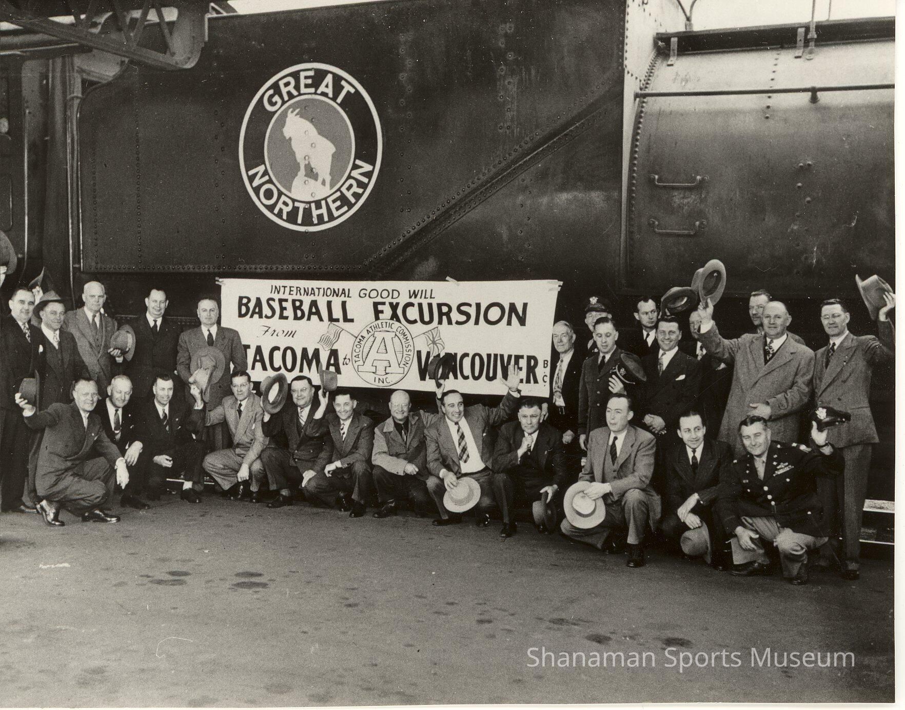 Twenty six unidentified members of a Tacoma baseball team pose in front of a Great Northern train and an “International Good Will Baseball Excursion from Tacoma Vancouver” banner.Lexicon