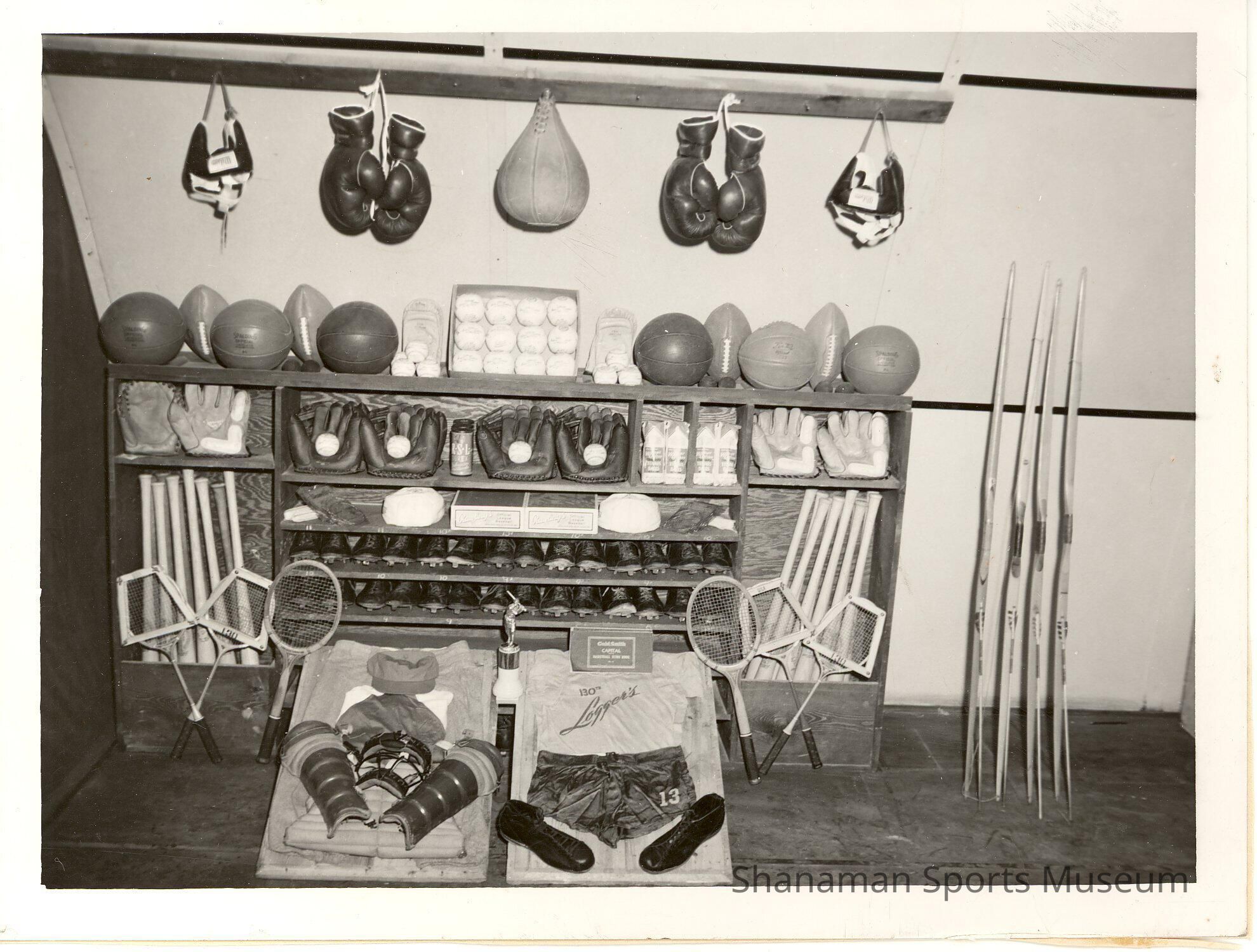 B/w photograph of sports gear on shelves or hanging for all types of sports, TAC.